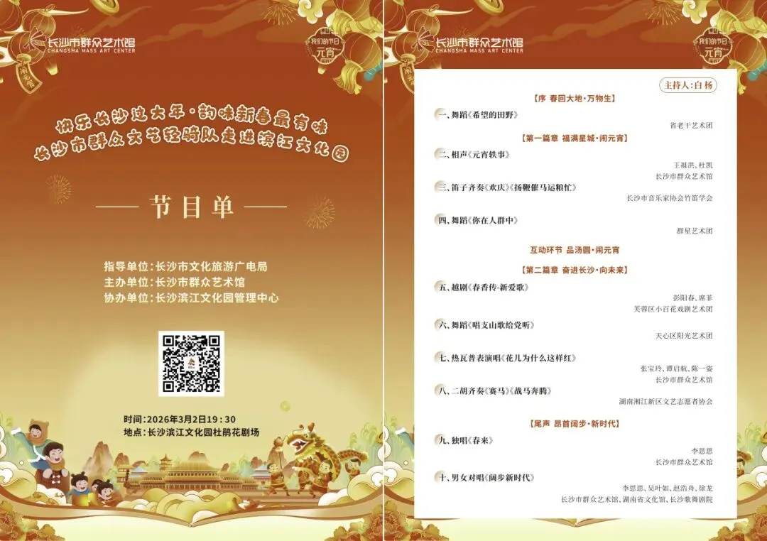 2026年3月2日(正月十四)晚,除舞龙舞狮表演外, “我们的节日・元宵” “快乐长沙过大年・韵味新春最有味”两大主题活动将携手走进长沙滨江文化园,为市民们带来一场节日狂欢。内场,精彩纷呈的节目轮番上演,让人目不暇接;外场,非遗民俗集市热闹非凡,烟火气十足,更有暖心汤圆免费派送、惊喜快闪欢乐互动,带您沉浸式解锁最有韵味的长沙元宵,共度团圆喜乐夜!