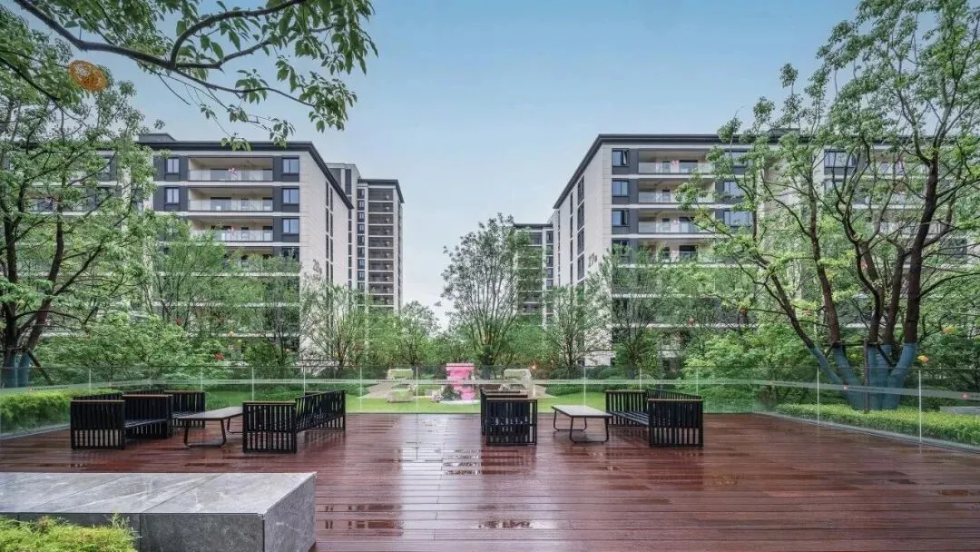 容积率仅2.0,300米巨幅景观中轴,樱花林、乌桕林枝繁叶茂,外立面窗墙比极高,采光面超好,楼栋门楼两侧对植了造型罗汉松和红枫,带集中供能。