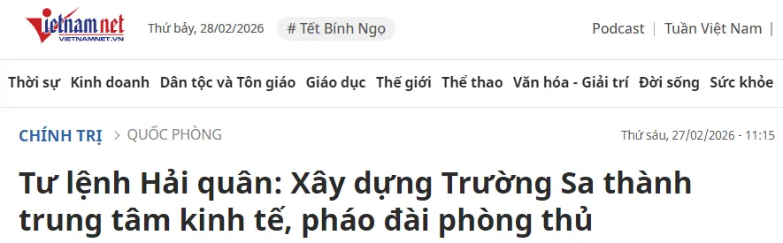 据越南媒体《Vietnamnet》2026年2月27日报道:"将长沙(即中国的南沙群岛,下同)建设发展成为全国海洋经济、文化、社会中心,成为捍卫祖国神圣主权的坚固堡垒"。