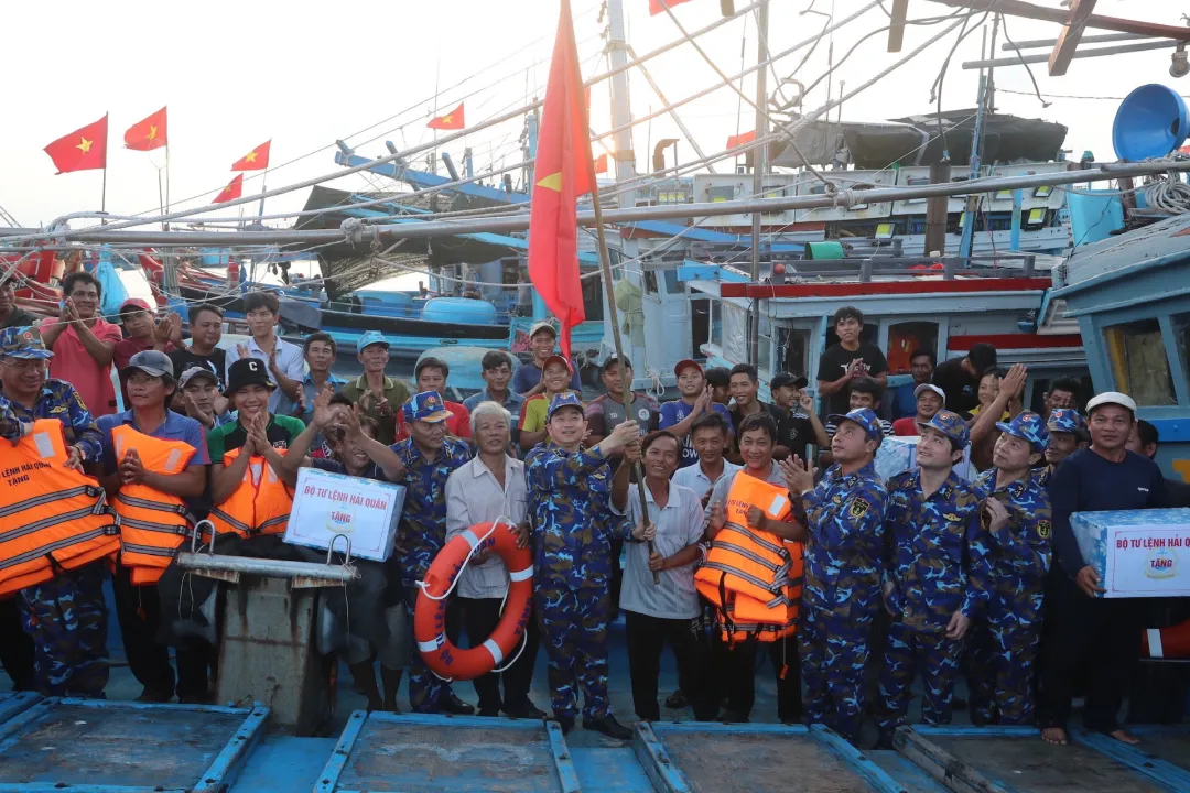 配图:越南海军司令陈清严副都督向在长沙特区捕捞的渔民赠送国旗