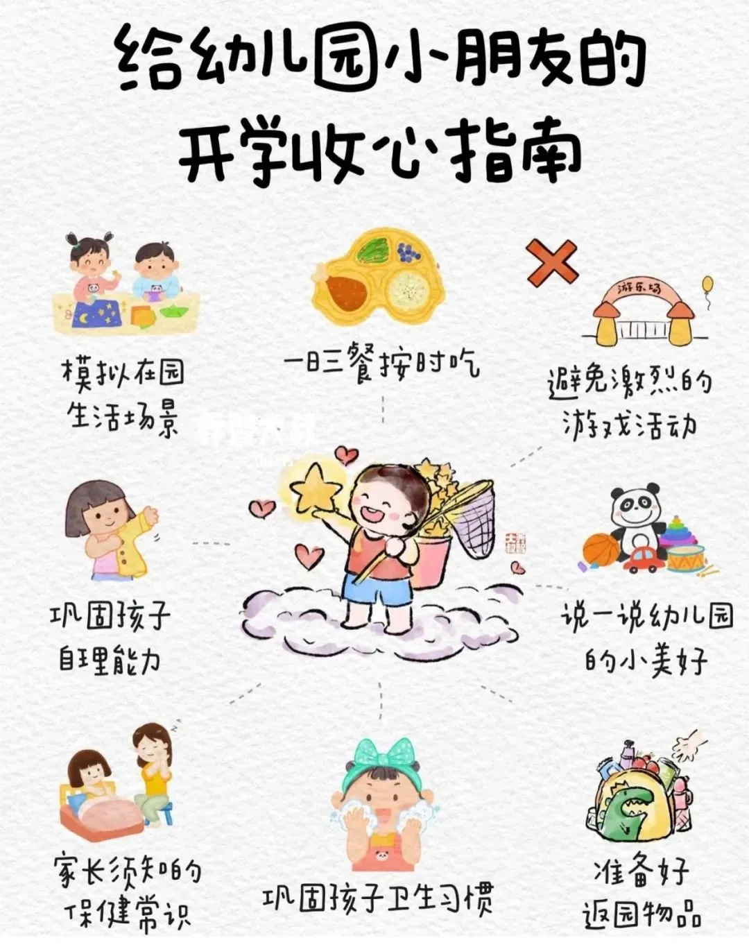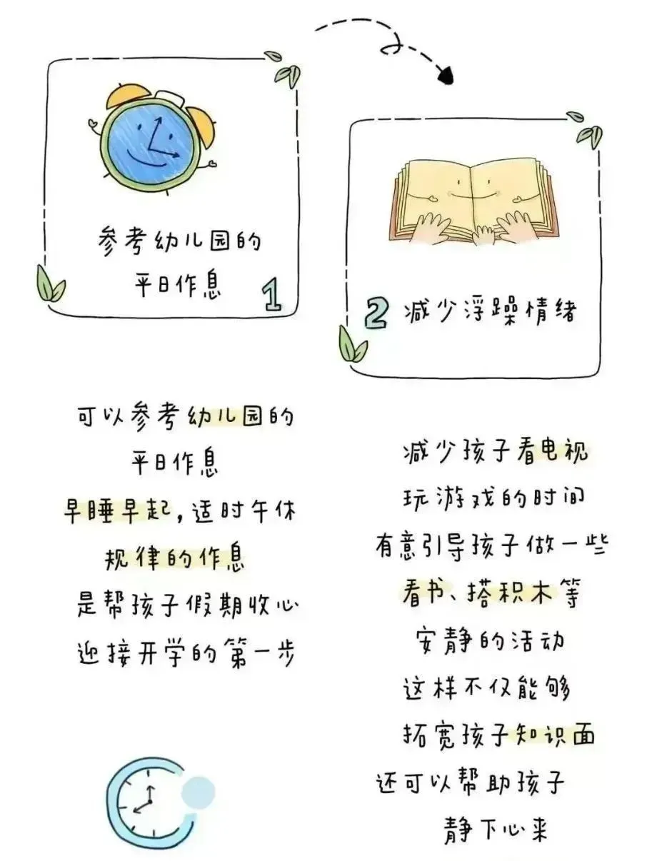 为了帮助小朋友顺利地从假期的家庭生活过渡到幼儿园的集体生活,请家长提前帮助小朋友调整到最佳状态,快乐从容开启新学期~