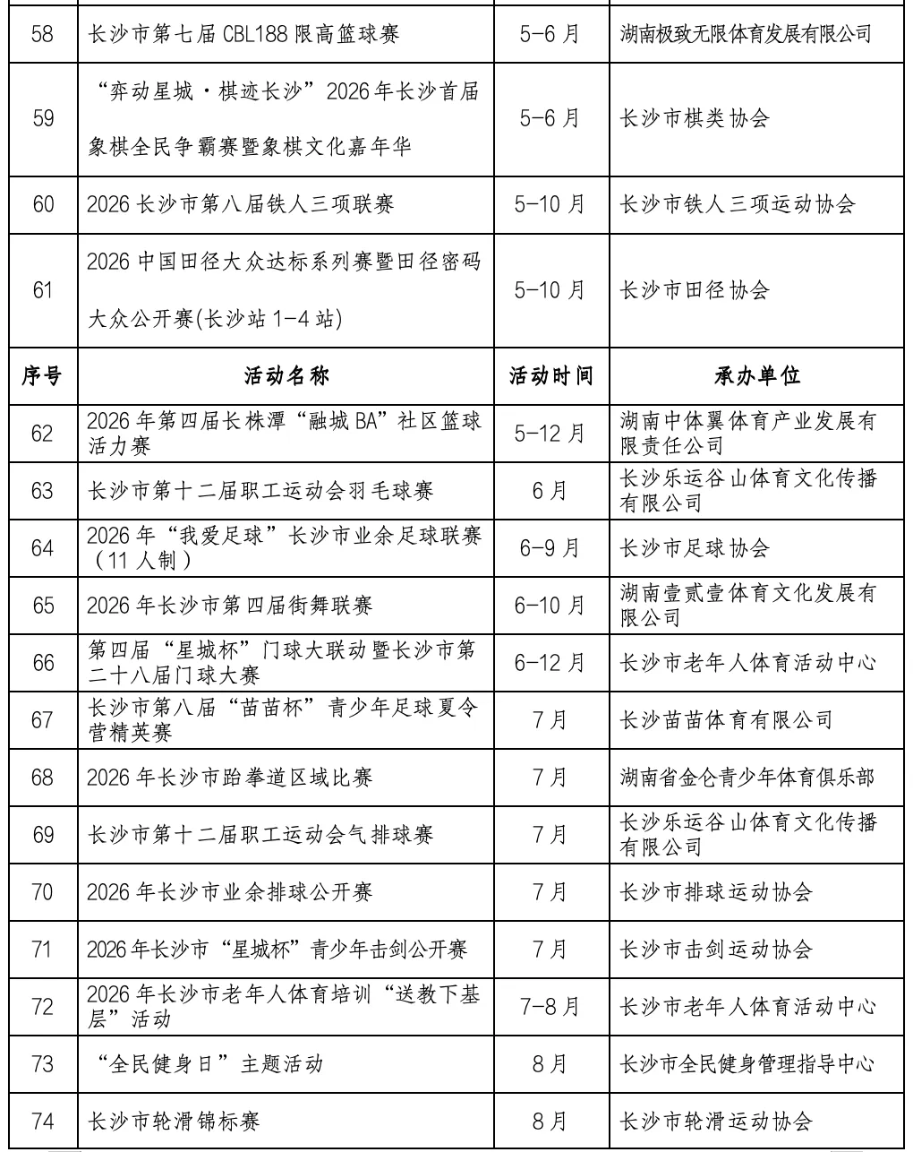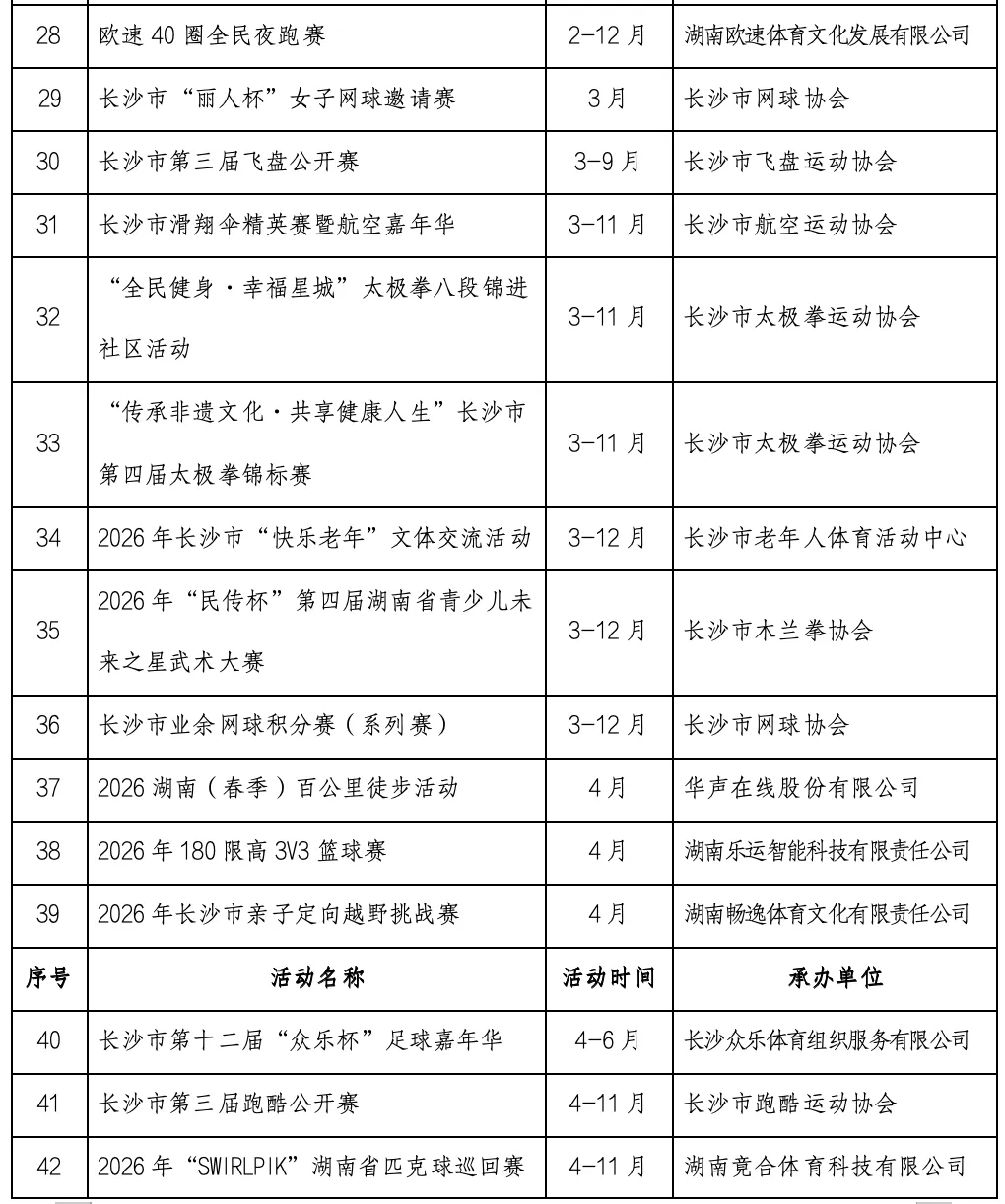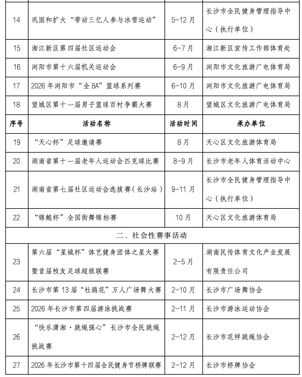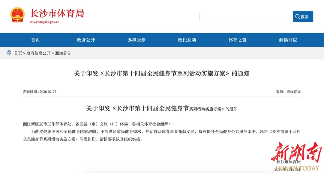 2月27日,记者从长沙市体育局了解到,《长沙市第十四届全民健身节系列活动实施方案》正式发布,95项赛事活动贯穿全年。活动由长沙市体育局、长沙市体育总会主办,各区县(市)、体育社会组织纷纷参与,掀起全民健身热潮。