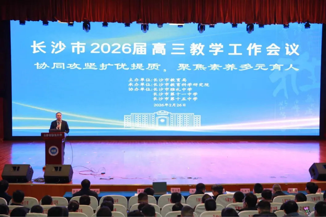新岁启程,马蹄声急。2026年2月26日,为解决调研中发现的问题,优化2026届高三教育教学工作,长沙市教育局、市教科院组织召开2026届高三教学工作会议,主题为“协同攻坚扩优提质,聚焦素养多元育人”。会议由市教育局基教处处长周小青主持,雅礼中学校长王良致辞。市区两级教育行政、教研部门分管领导,各高中分管教学领导、高三教师代表,长沙市普通高中学科教学研究工作室成员等1000余人参会,共商高三教育教学工作。