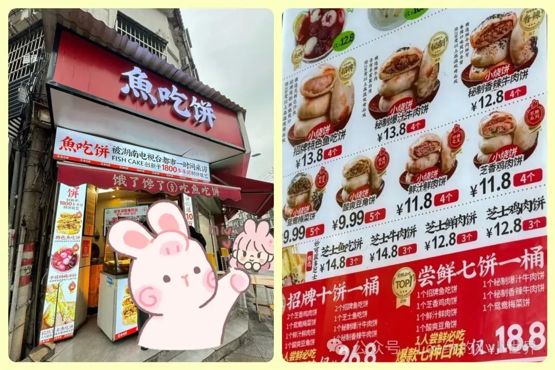 这家店叫“鱼吃饼”,就在局关祠蔡锷路口上,主要是卖那种小烧饼的。味道谈不上多么惊艳,但是呢,外皮不油腻,馅儿也干净、调味适度。