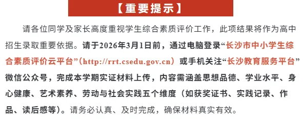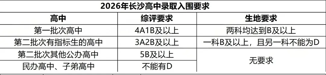 想要报考长郡中学、雅礼中学、长沙市一中、湖南师大附中、明德中学第一批次高中学校,综合素质评价要求4A1B。另外,综合素质测评有D不能毕业,高中学校一律不予录取。往年即使分数超过了四大录取线,却因综素评价不达标而无缘四大的例子也并不少见。
