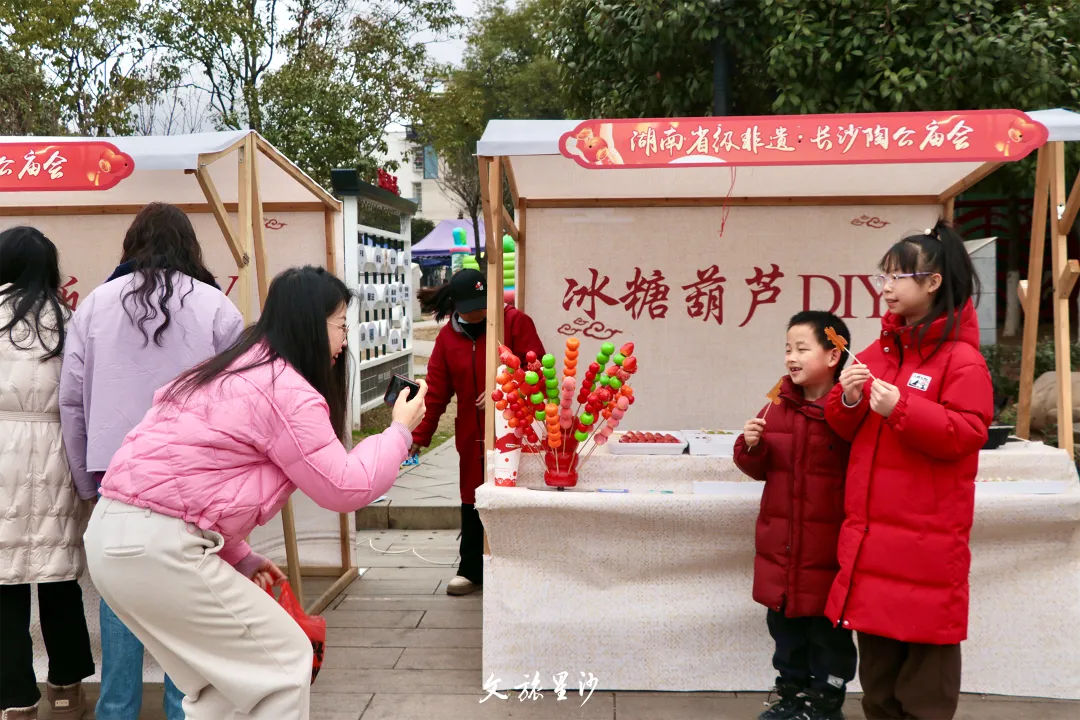 非遗市集也很有逛头,有玉和醋、口口香、潭洲农业、麻姑井乳等县级非遗展示,更有沩山传统香制作技艺、糖画制作技艺、浏阳炒货传统制作工艺、十三村酱菜制作技艺等市级非遗展示。
