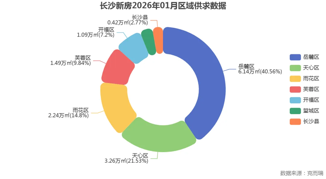 数据显示,2026年1月长沙新房成交主要集中在岳麓区、天心区和雨花区,开福区成交建面仅占7.2%,说明即使在主城区,不同板块的市场热度也存在明显差异。