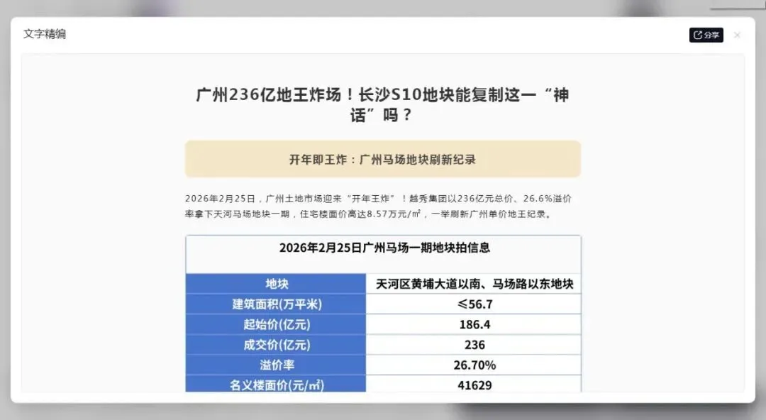 2026年2月25日,广州土地市场迎来“开年王炸”!越秀集团以236亿元总价、26.6%溢价率拿下天河马场地块一期,住宅楼面价高达8.57万元/㎡,一举刷新广州单价地王纪录。