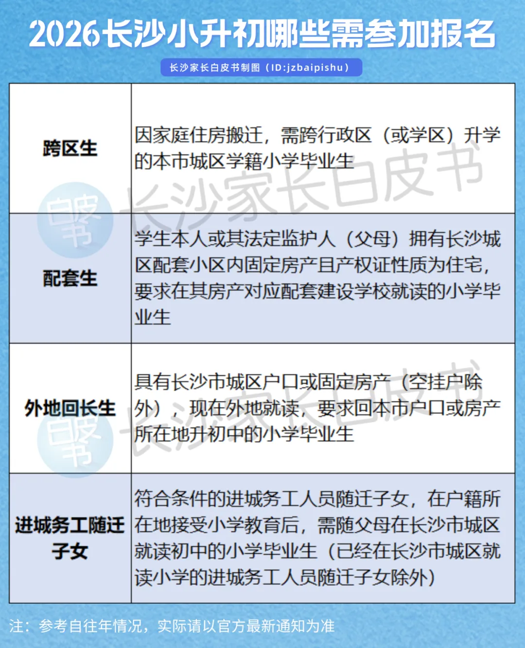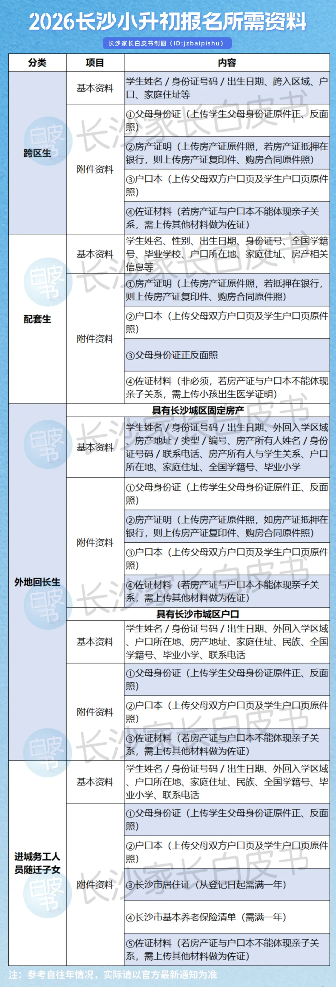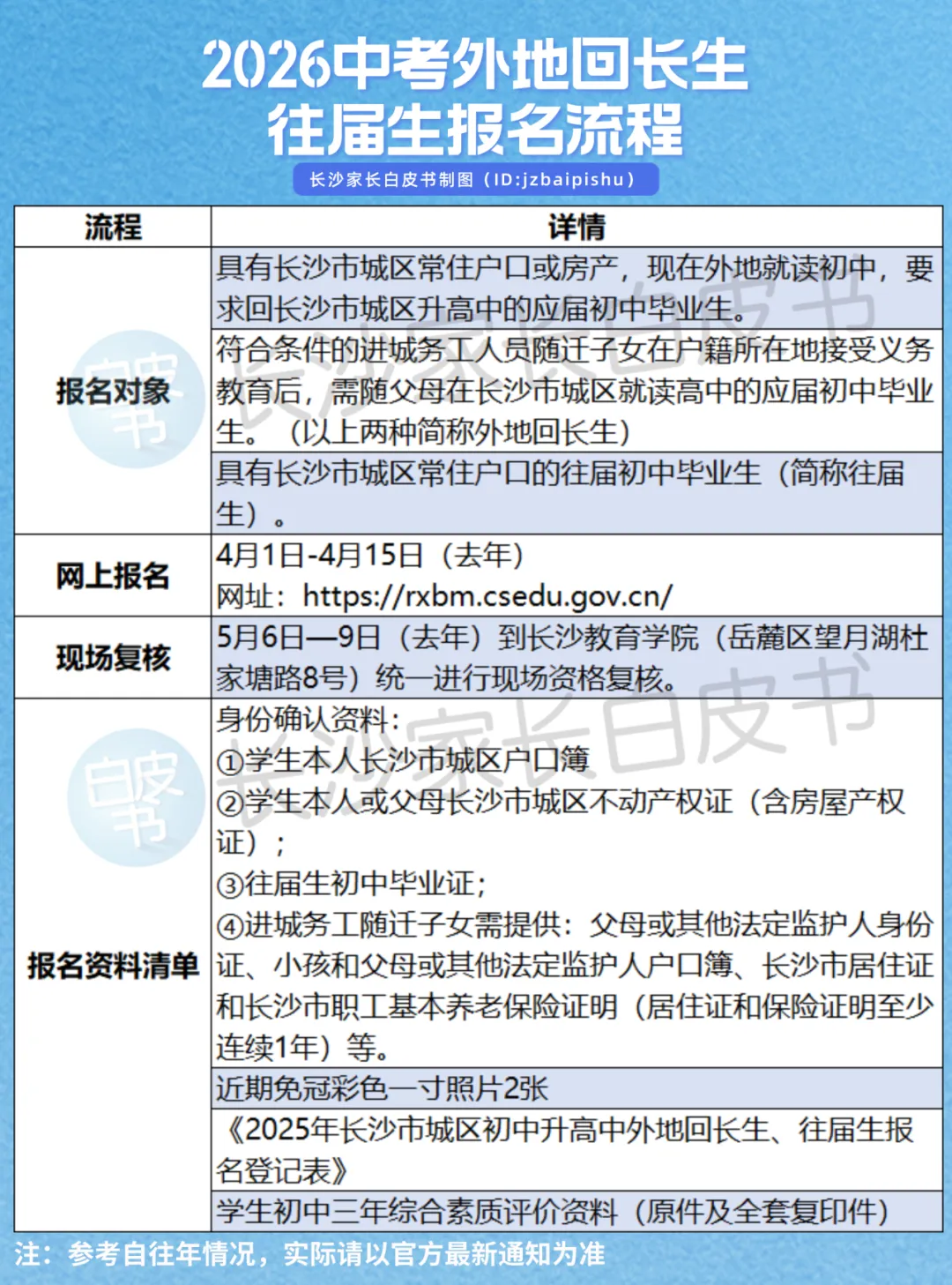 根据以往情况,外地回长生和往届生也需要在4月1日-4月15日(去年时间)在“长沙普通中小学入学报名系统”中录入相关信息,进行网上报名。相关的资料也需要在3月份提前准备好哦!