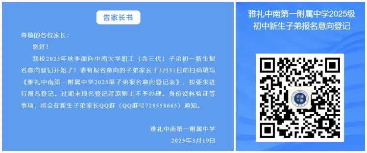 下面是去年雅礼中南一附中的招生通知,大家可以参考下(二维码已无法扫描)。
