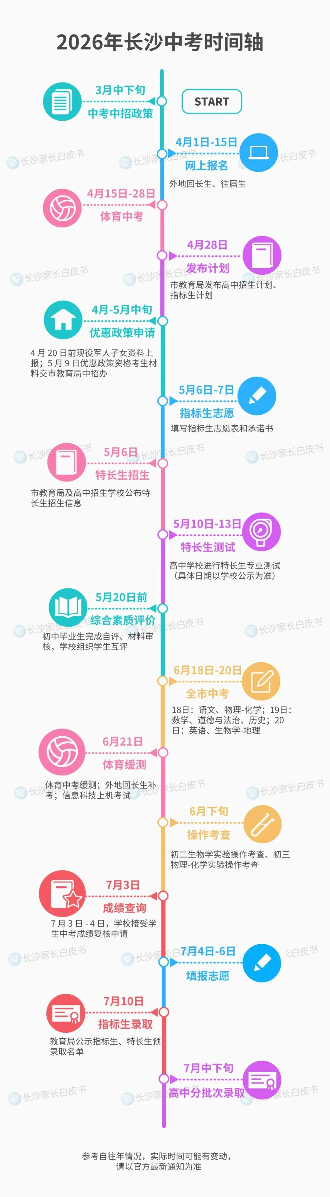 长沙市教育局会在3月公布当年最新中招政策,会公布考试科目、考查科目、考核科目具体的分值、成绩呈现方式,还有综合素质评价的要求、高中录取规则,以及指标生分配方式、加分政策等。