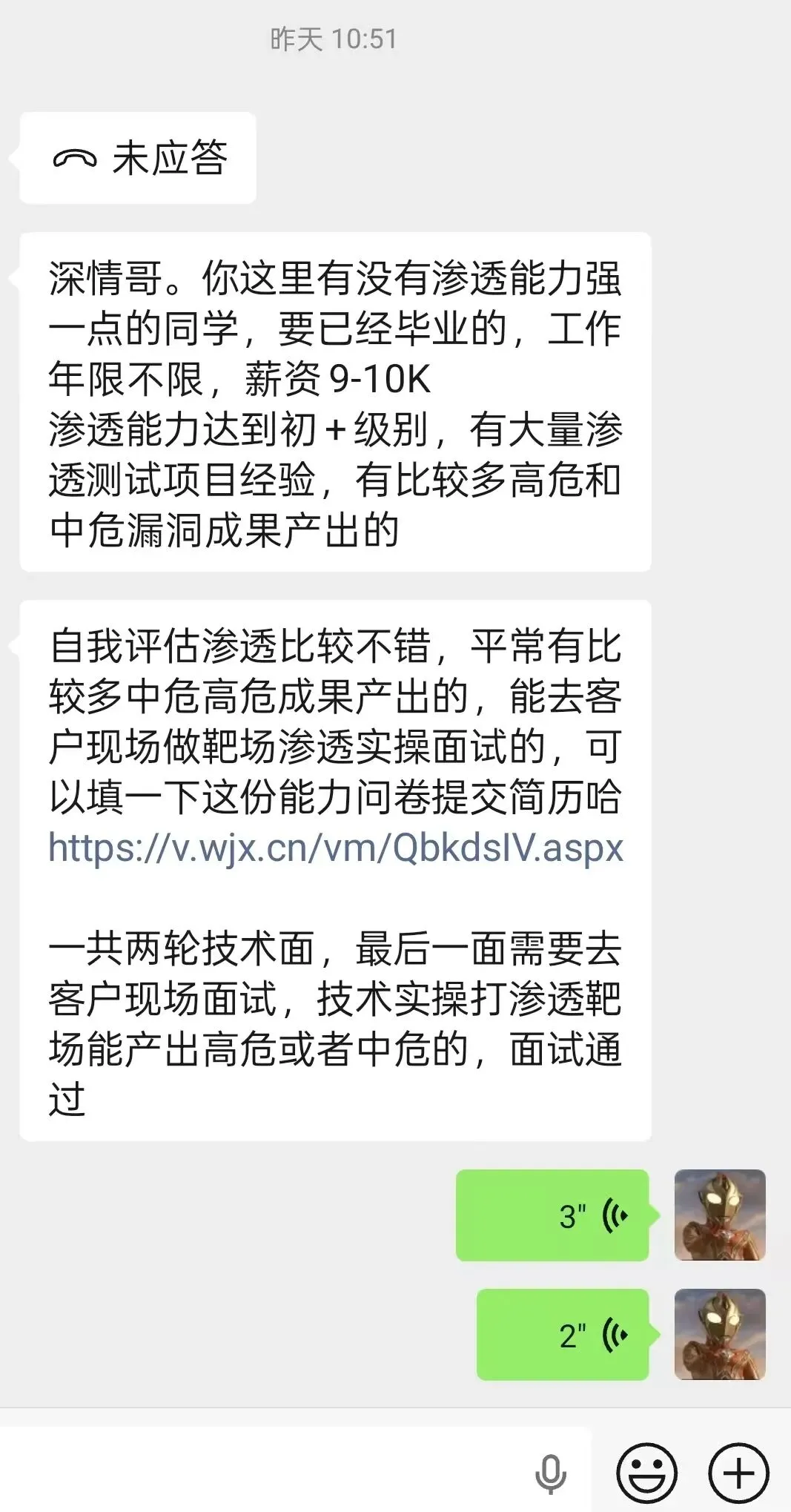 深圳渗透兼职,工资1万-1万1每月渗透测试人员,中级能力,必须要2023年及之前毕业,经验:具备2年及以上渗透测试经验;项目经验:要求拥有安全测试服务项目经验;其他要求:精通常见的OWASP TOP 10安全漏洞及攻击技术,并深入了解漏洞原理,具备web应用漏洞挖掘、业务逻辑漏洞挖掘的实战经验。时间:要6个渗透工程师,服务3-6个月