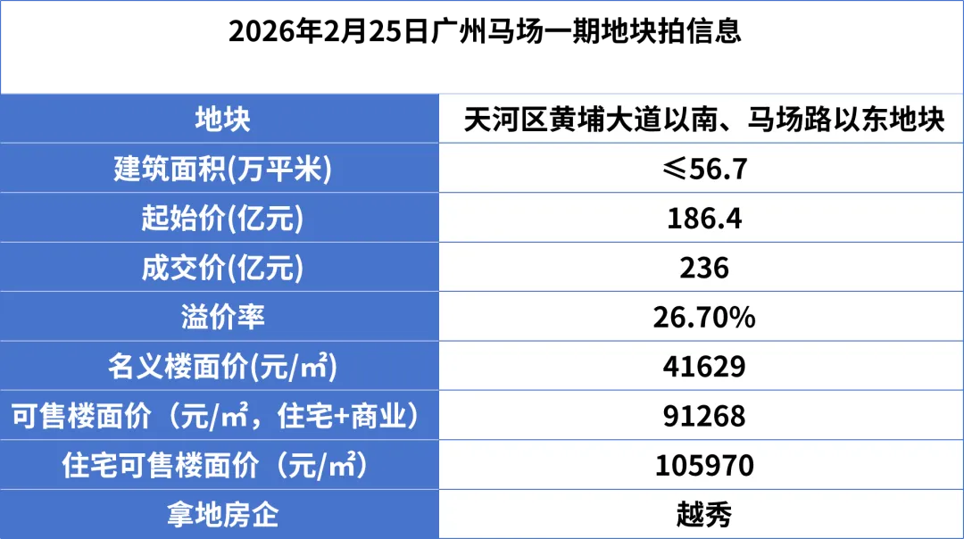 2026年2月25日,广州土地市场迎来“开年王炸”!越秀集团以236亿元总价、26.6%溢价率拿下天河马场地块一期,住宅楼面价高达8.57万元/㎡,一举刷新广州单价地王纪录。