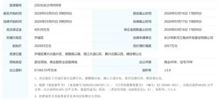 就在广州地王诞生的同时,长沙S10地块也迎来第三次挂牌。这块位于开福区黄兴北路片区的商住用地,出让面积61365.55㎡,容积率≤3.0,起始价20.27亿元,起始楼面价约11010元/㎡。