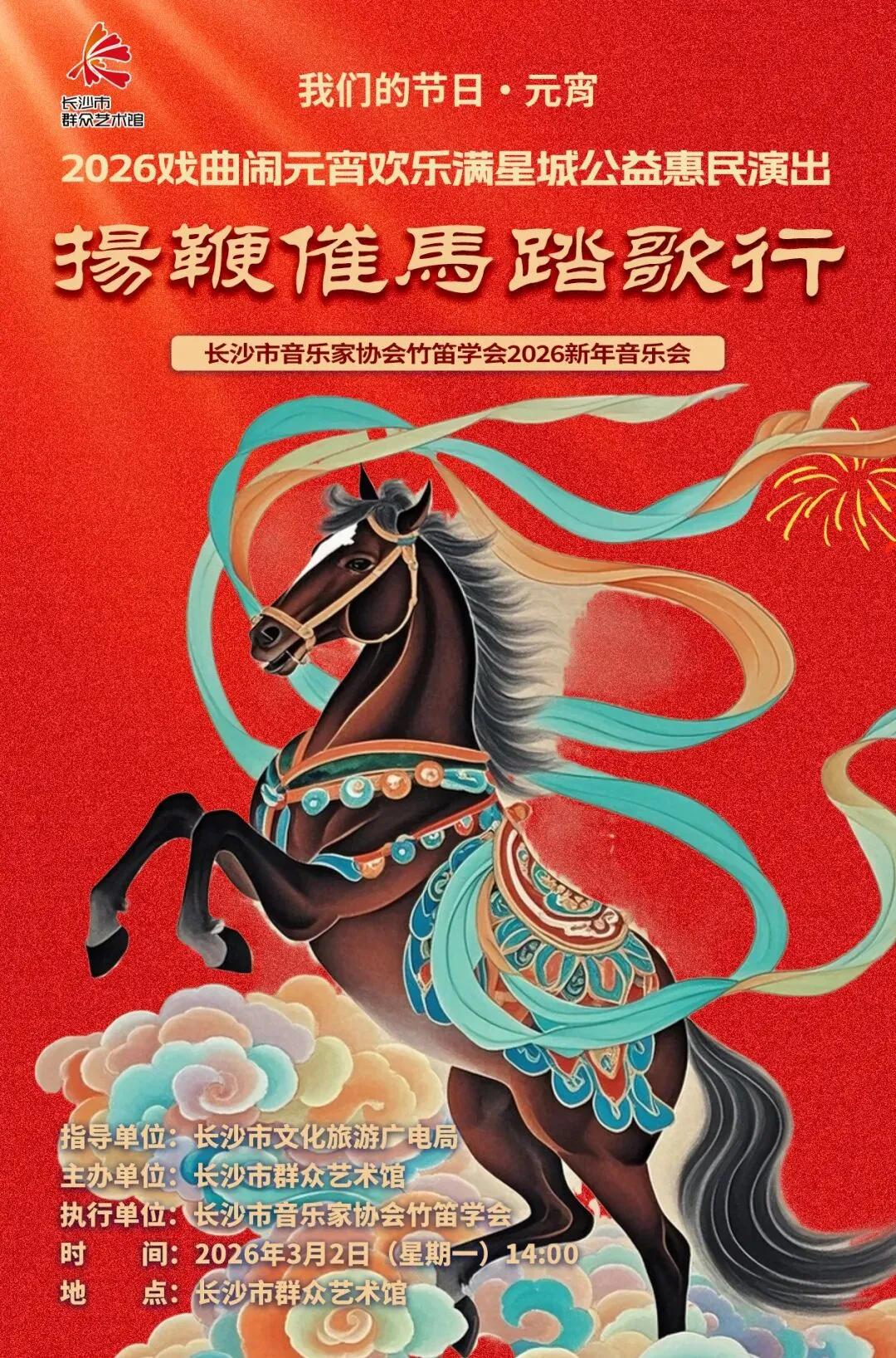 3月2日(正月十四),2026戏曲闹元宵 欢乐满星城公益惠民演出——“扬鞭催马踏歌行”长沙市音乐家协会竹笛学会2026新年音乐会,将在长沙市群众艺术馆前坪精彩上演,诚邀市民朋友们共赏竹笛雅韵!