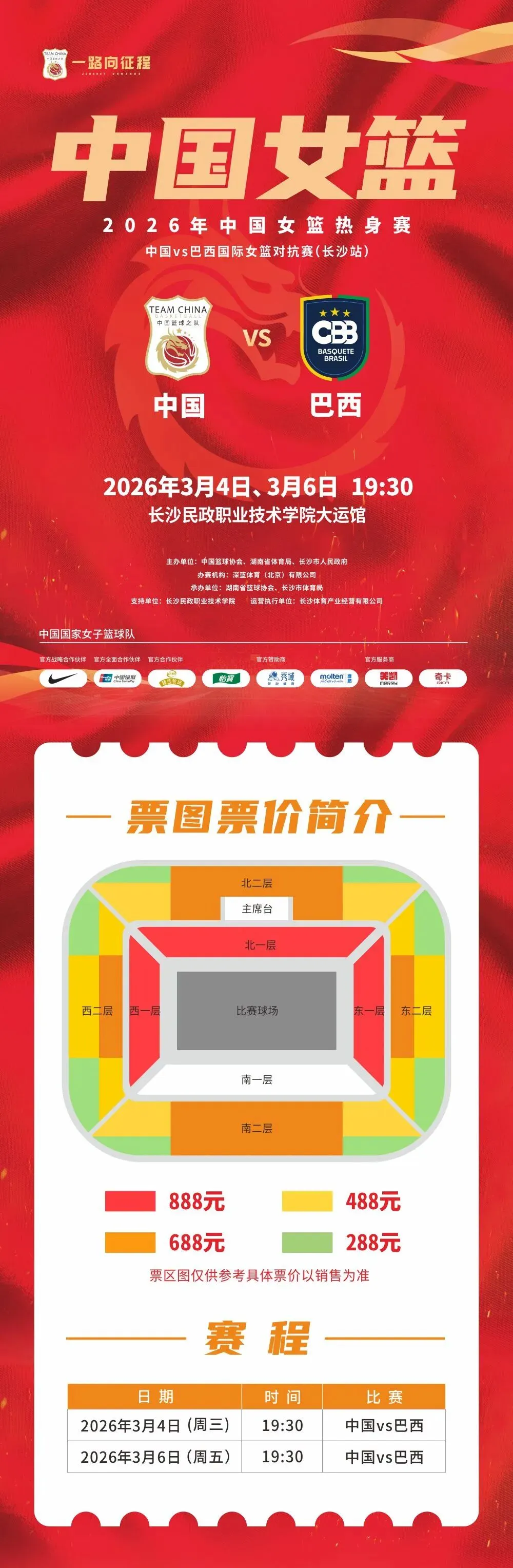 3月4日与6日,看桑巴旋风如何在星城刮起,看世界劲旅如何向“无畏金兰”发起冲击!目前赛事门票正在大麦网APP、看个比赛、秀动、抖音等官方指定票务平台火热销售中,球迷可前往各平台选购,共赴这场国际篮球盛宴。