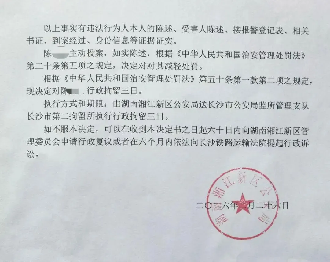 湖南湘江新区公安局2026年2月26日开具的《公安行政处罚决定书》显示,陈某某,1991年生,大学本科文化。现查明:违法行为人陈某某为发泄内心对郭女士的不满,在自己家中通过抖音、小红书,发布涉及郭女士或者家人的视频、截图、评论,公然侮辱、诽谤郭女士及其家人。