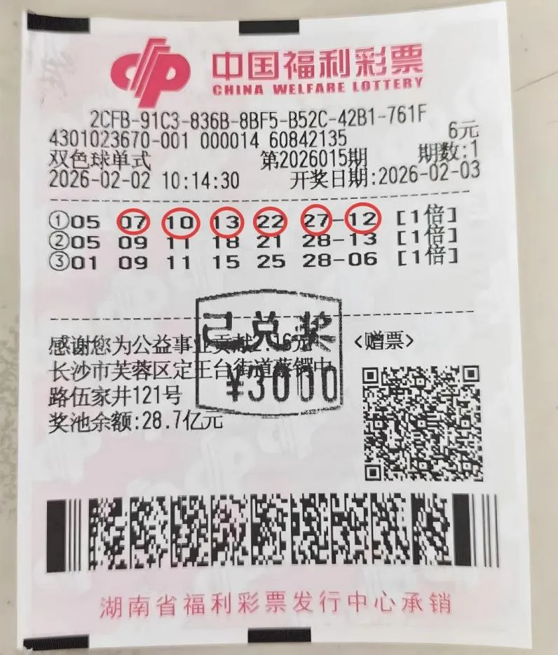 2月3日,福彩双色球第2026015期开奖,4301023670网点传出喜讯,一位彩民凭借“1238・哆来咪发”双色球福粉日活动赠票,喜中双色球三等奖1注,奖金3000元。该彩民当期在该网点购买了1张7+1复式票未中奖,却意外靠活动赠票收获3000元惊喜。
