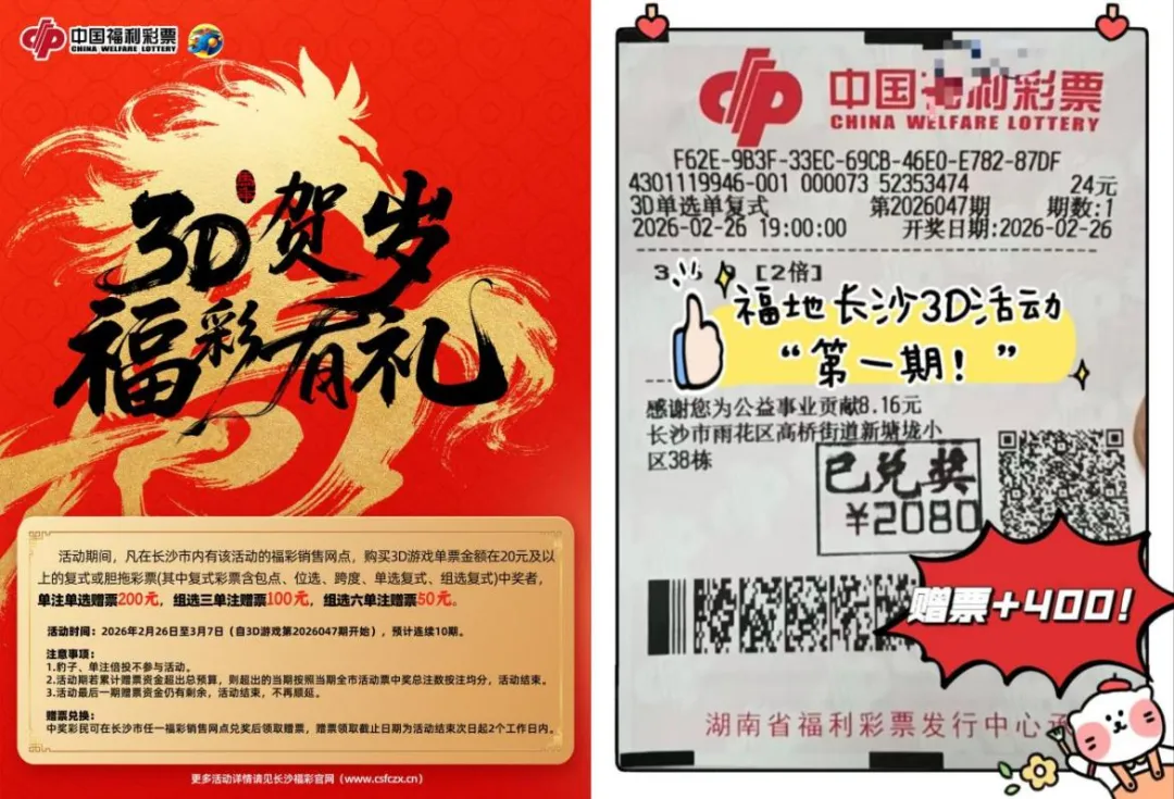 目前另有“3D贺岁·福彩有礼”活动火热进行中,2月26日至3月7日期间,购买单票购彩金额在20元及以上的指定复式/胆拖票并中奖,最高可获200元/注赠票,双份好运加持,让你元宵沾喜气,数字撞出好彩头!
