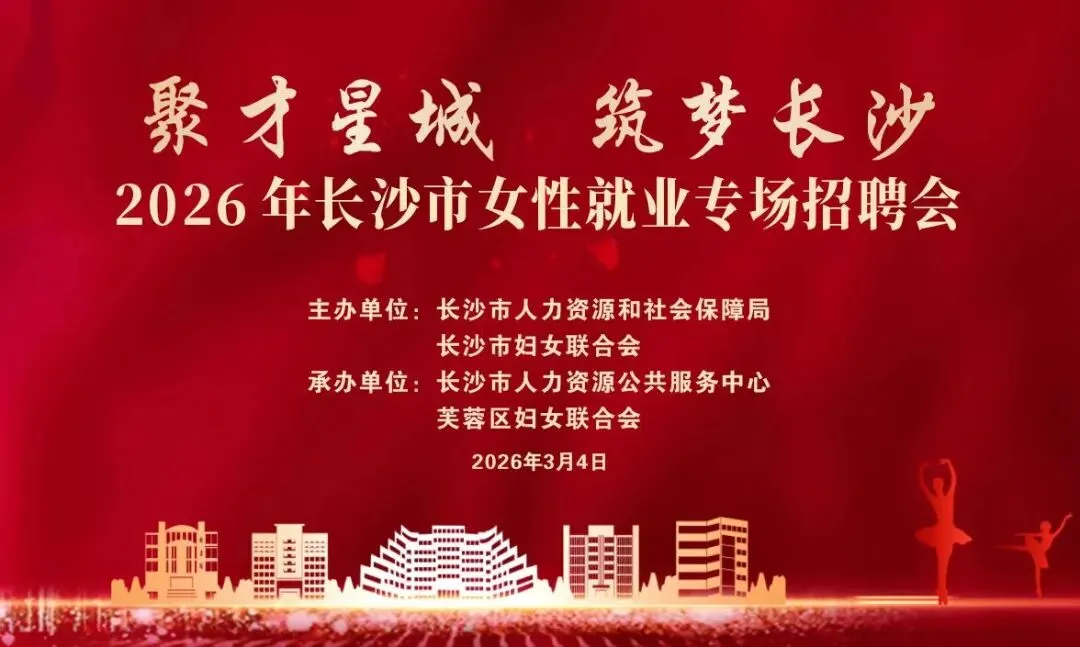为全面贯彻党的二十大和二十届历次全会精神,切实拓宽女性就业路径,保障女性合法权益,在第116个“三八”国际妇女节即将到来之际,3月4日(周三)上午,由长沙市人力资源和社会保障局、长沙市妇女联合会主办,长沙市人力资源公共服务中心、芙蓉区妇女联合会承办的“聚才星城 筑梦长沙”2026年长沙市女性就业专场招聘会,将在长沙市人力资源市场举行。