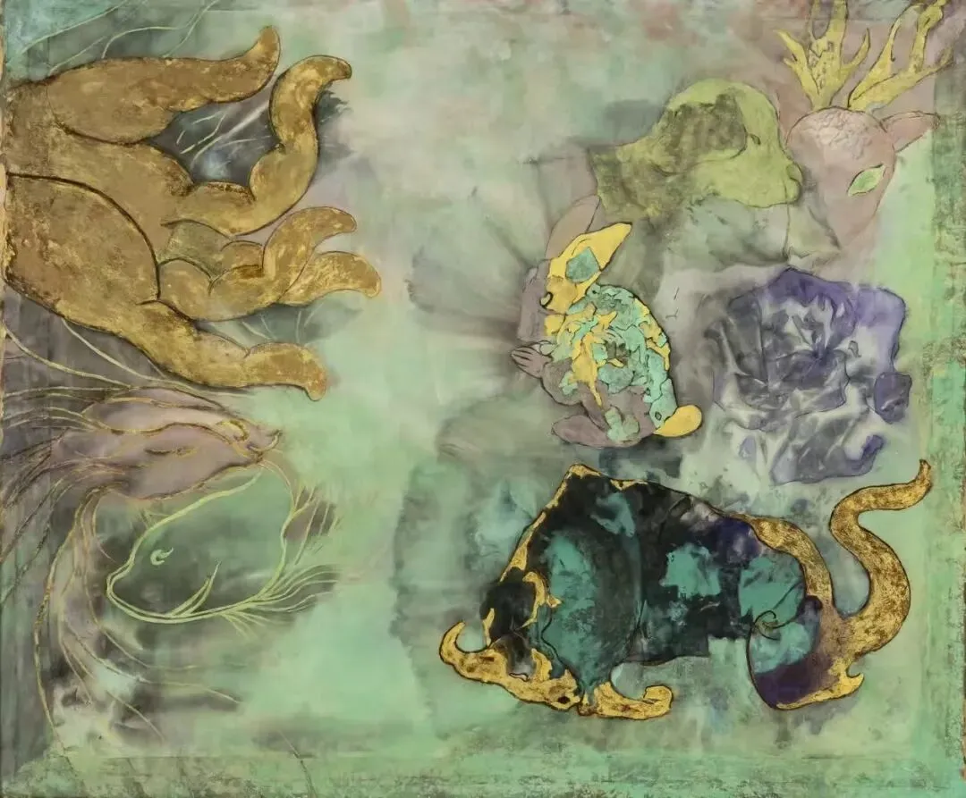 张健画了多个系列的关于宗教主题的作品,可以说宗教主题是她着力最多的方向之一。她反复用多种形式,尝试各种语言、图式来表达这个题材。但她却一直止于“情怀”而没有成为信徒,这是美学的方式。张健是用美学的方式表达对宗教的真挚的态度,或者我们可以用“美学救赎”来描述张健的方式更为适当。蔡元培先生从欧洲游学和考察回国后曾提出“美育代宗教”的命题,这个命题从中国人的精神学和文化学的两个层面都是切中中国人精神文化本质的,可惜的是蔡元培的这个“美育救世”的命题,却由于百年社会形态的变形和人心的浮躁而没有进入社会实践的层面。
