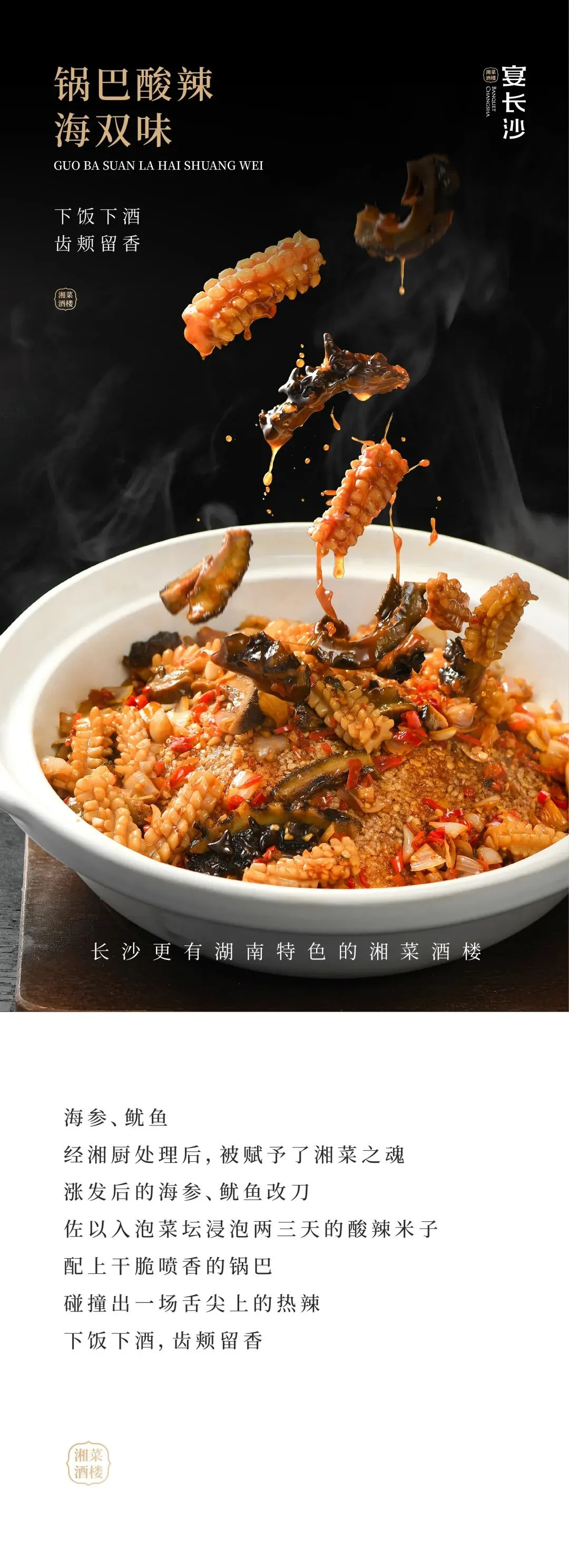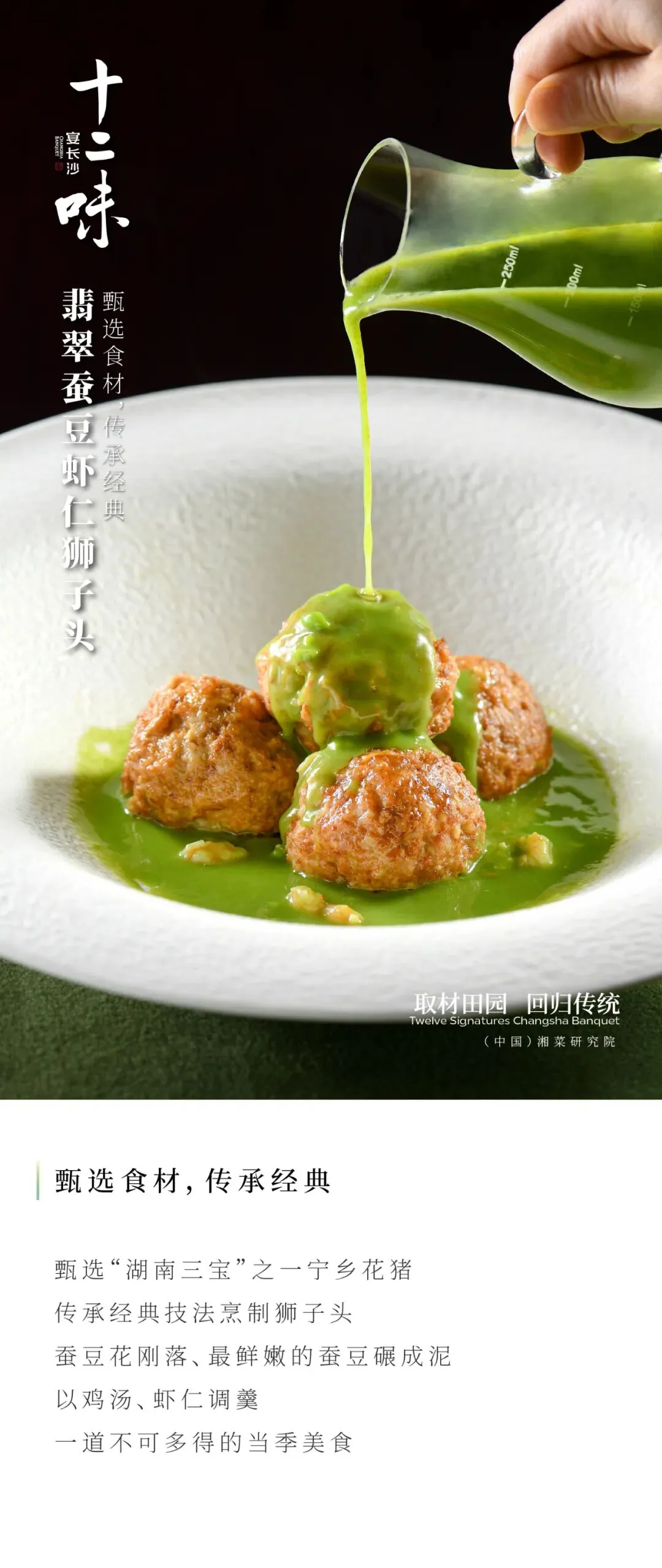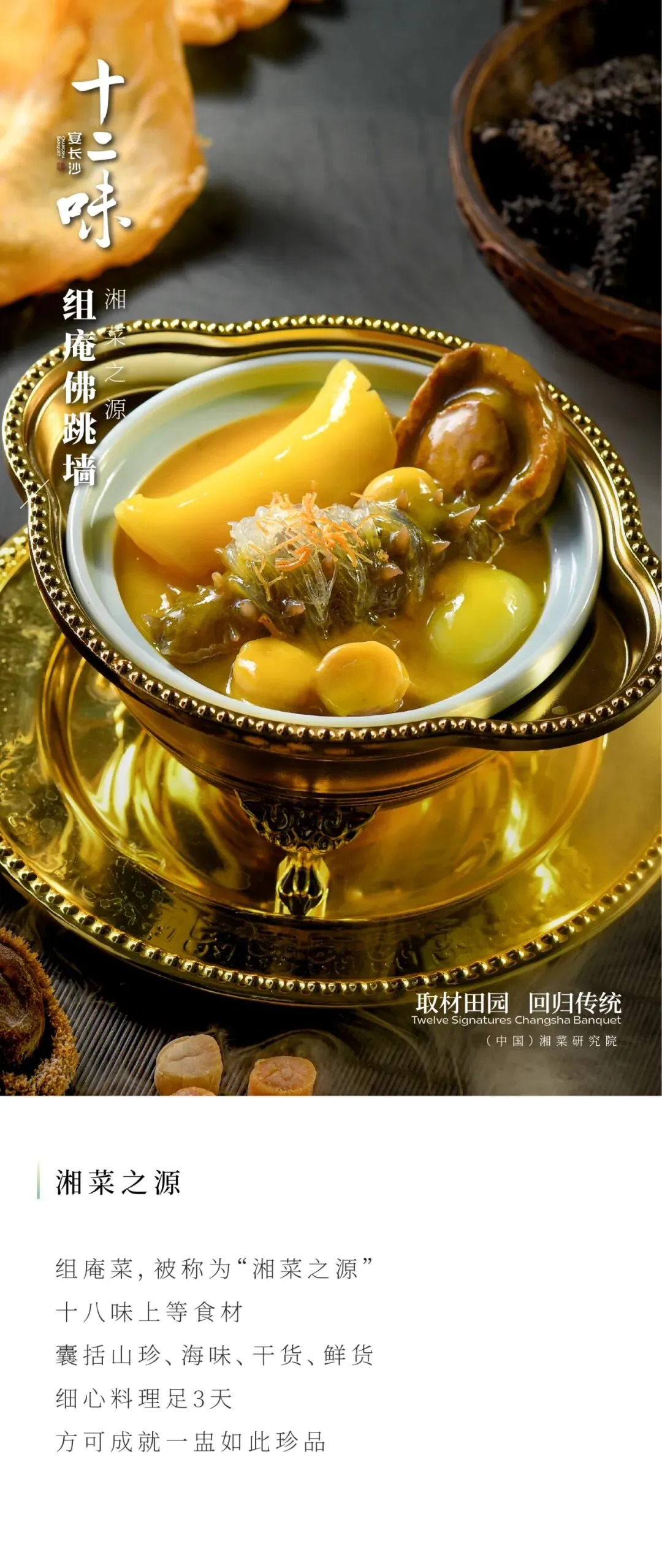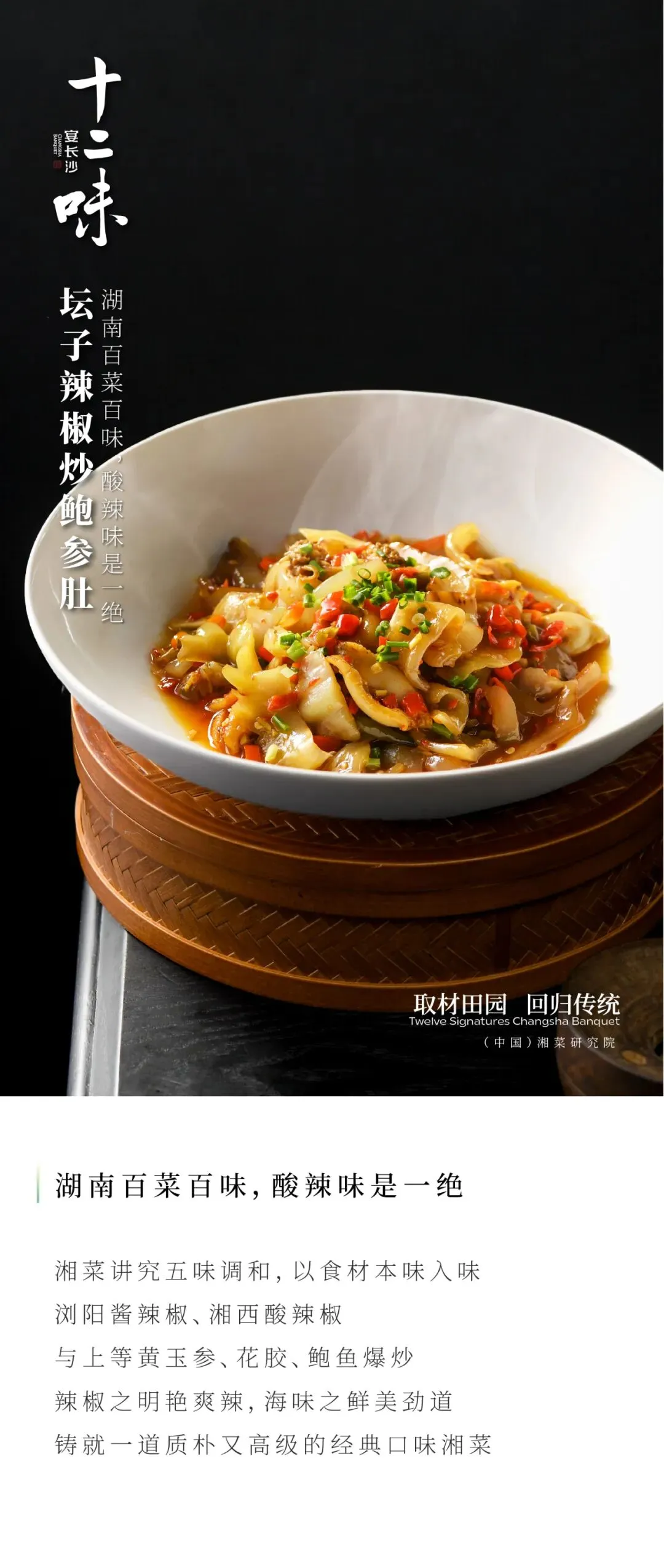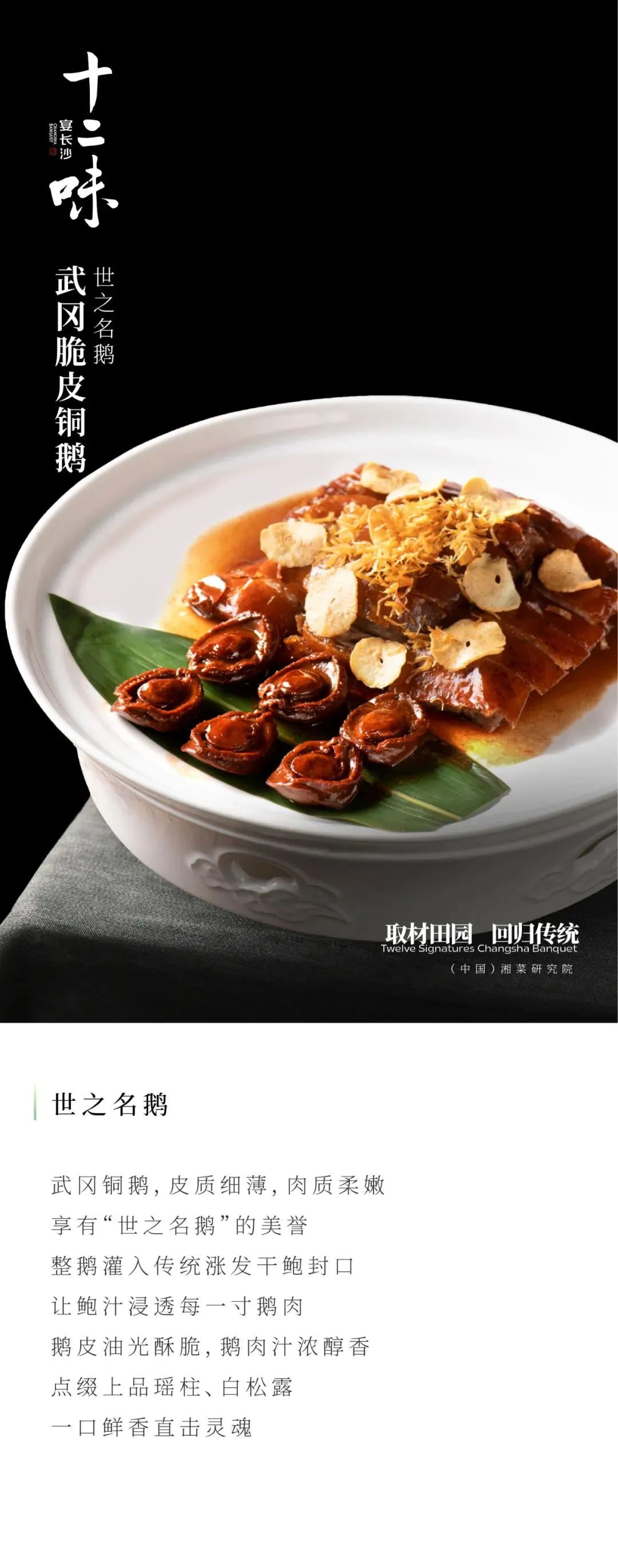 在菜品上,十二味·宴长沙并不拘泥于湖南本土食材,而是放眼全国甚至全球,利用湘菜的烹饪手法来做;而针对原有的经典湘菜,则在传统基础上融入新元素,加入了海鲜的新化海鲜三合汤,以鲜为主、酸辣为辅的酸汤波龙,搭配干鲍鱼一起烤制的武冈铜鹅等等。