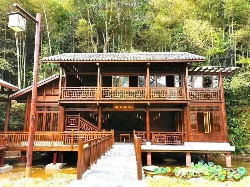 将自然美和人文美融合在一起,所有的木质建筑使用的都是古代建房的技艺,是榫卯结构,景区所有建筑都是依山而建,最大程度保护了汤里的自然生态