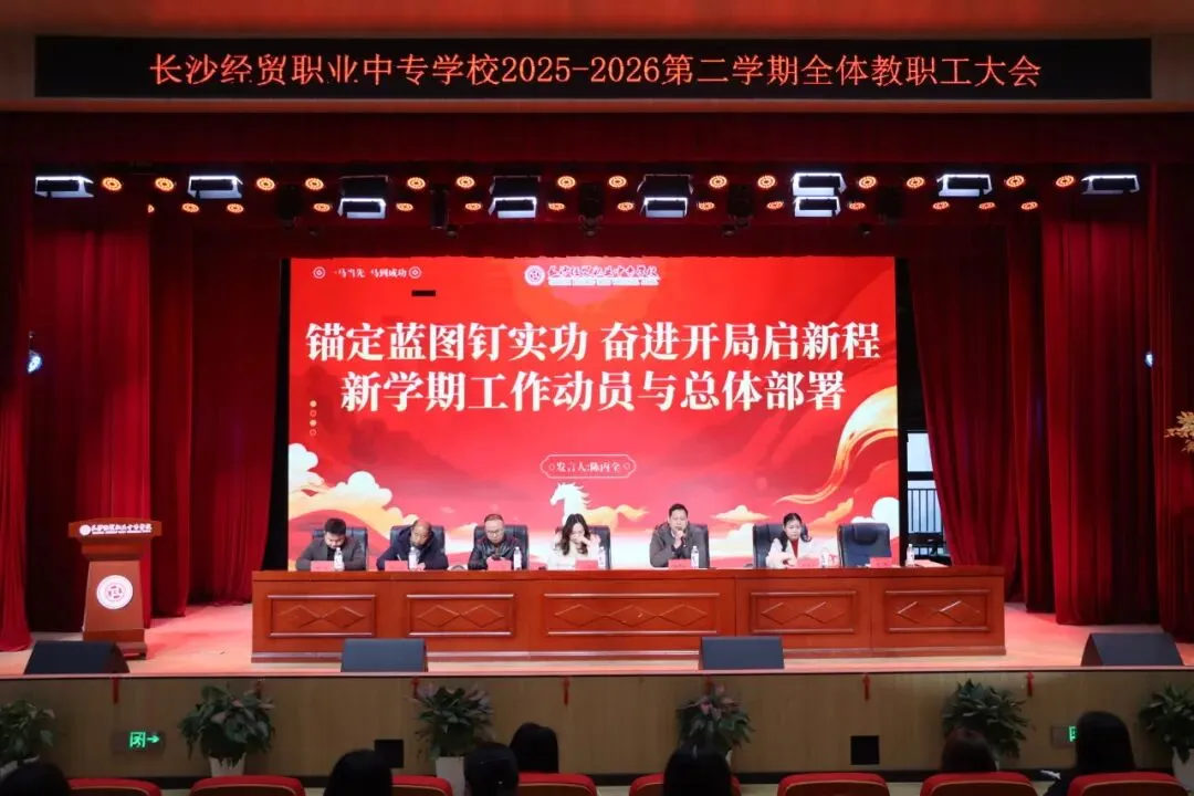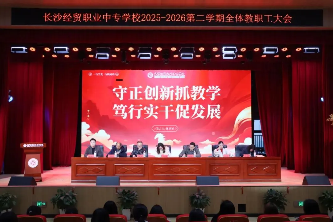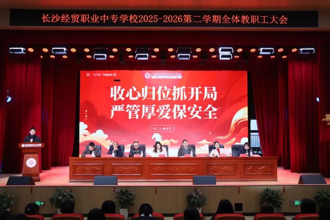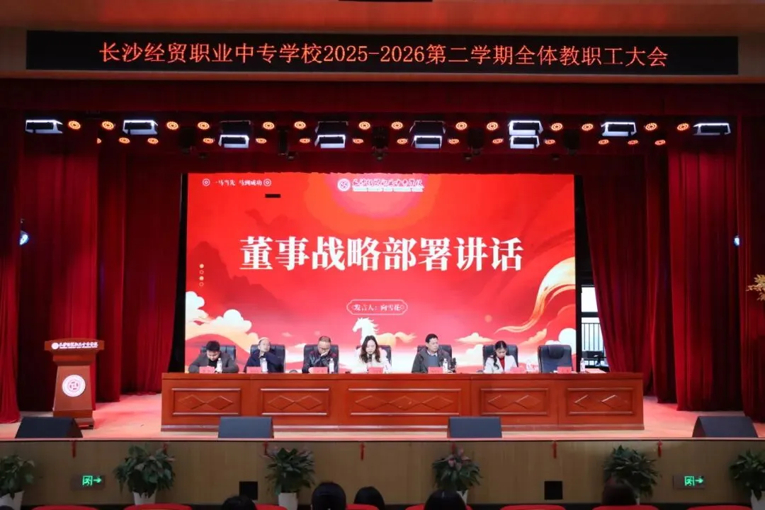 2月28日,长沙经贸职业中专学校2025-2026学年第二学期全体教职工大会隆重召开。董事向雪花、党支部书记、校长陈丙全、副校长刘军、副校长孙齐芳、副校长龙卫星、校长助理、团委书记谢钢。校务委员人事督导处处长文利与全体教职员工齐聚一堂,共同擘画新学期发展蓝图。大会围绕表彰先进、作风建设、师德师风、教学教研、德育安全、招生工作、校长部署、董事领航八大议程,为新学期各项工作锚定方向、凝聚力量。在这个充满希望的丙午马年,全体经贸人正以“起步就是冲刺”的姿态,策马扬鞭,奔向新征程。