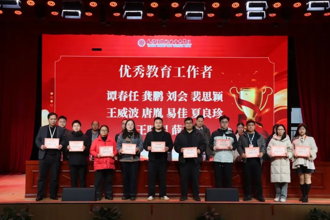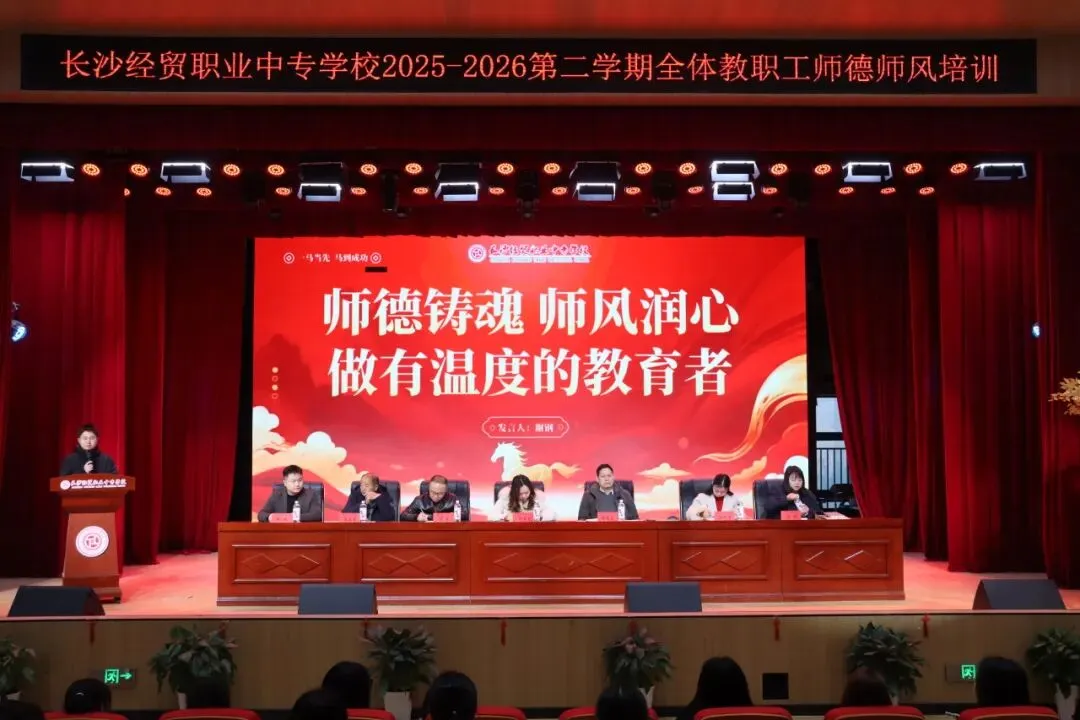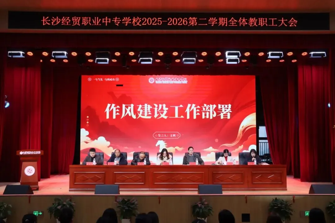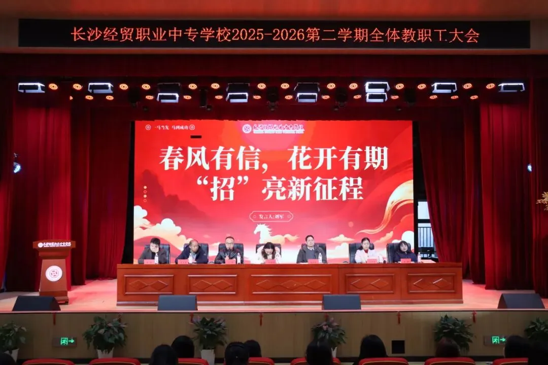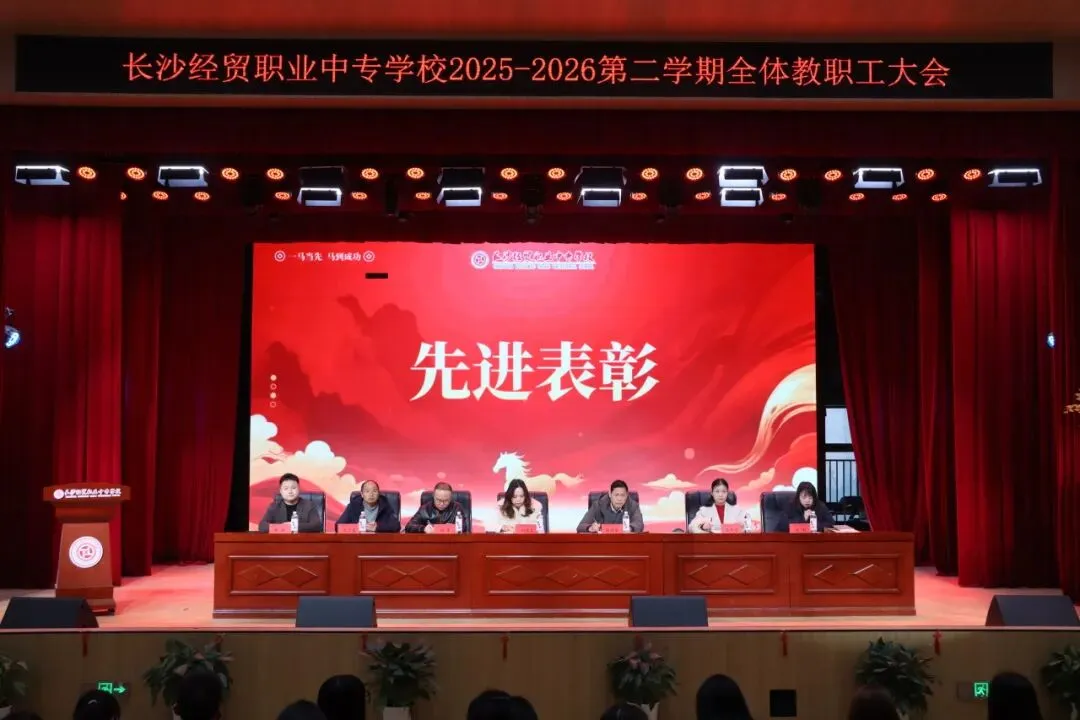 2月28日,长沙经贸职业中专学校2025-2026学年第二学期全体教职工大会隆重召开。董事向雪花、党支部书记、校长陈丙全、副校长刘军、副校长孙齐芳、副校长龙卫星、校长助理、团委书记谢钢。校务委员人事督导处处长文利与全体教职员工齐聚一堂,共同擘画新学期发展蓝图。大会围绕表彰先进、作风建设、师德师风、教学教研、德育安全、招生工作、校长部署、董事领航八大议程,为新学期各项工作锚定方向、凝聚力量。在这个充满希望的丙午马年,全体经贸人正以“起步就是冲刺”的姿态,策马扬鞭,奔向新征程。