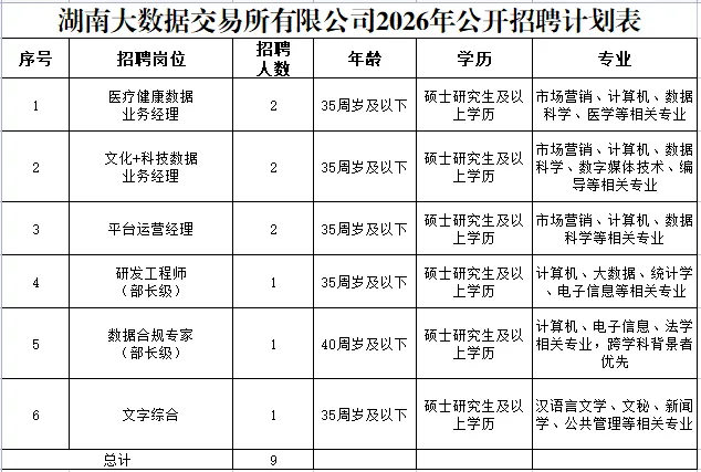 本次招聘工作人员共9名,详见《湖南大数据交易所有限公司2026年公开招聘计划表》(附件1)。实行劳动合同制管理,按程序办理入职手续时明确具体单位及岗位。