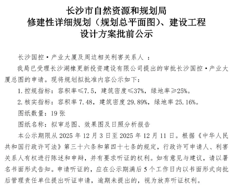 项目于2024年前后正式启动相关前期工作,包括施工图设计招标(2024年11月发布招标公告)。进入2025年后,建设进入实质推进阶段。2025年上半年,项目已完成部分前期招标,如周边环境调查及超前钻服务招标(2025年6月)。2025年7月,发布超高层部分和住宅部分工程检测服务招标公告,表明主体结构施工已进入关键检测准备阶段。截至2025年中期,项目整体进展顺利,并已完成2.8万㎡的招商意向签约,显示出较好的市场认可度。2025年底至2026年初,长沙国控集团在集团层面持续强调该项目作为城市更新“主战场”的重要性,并纳入集团高质量发展重点工程。