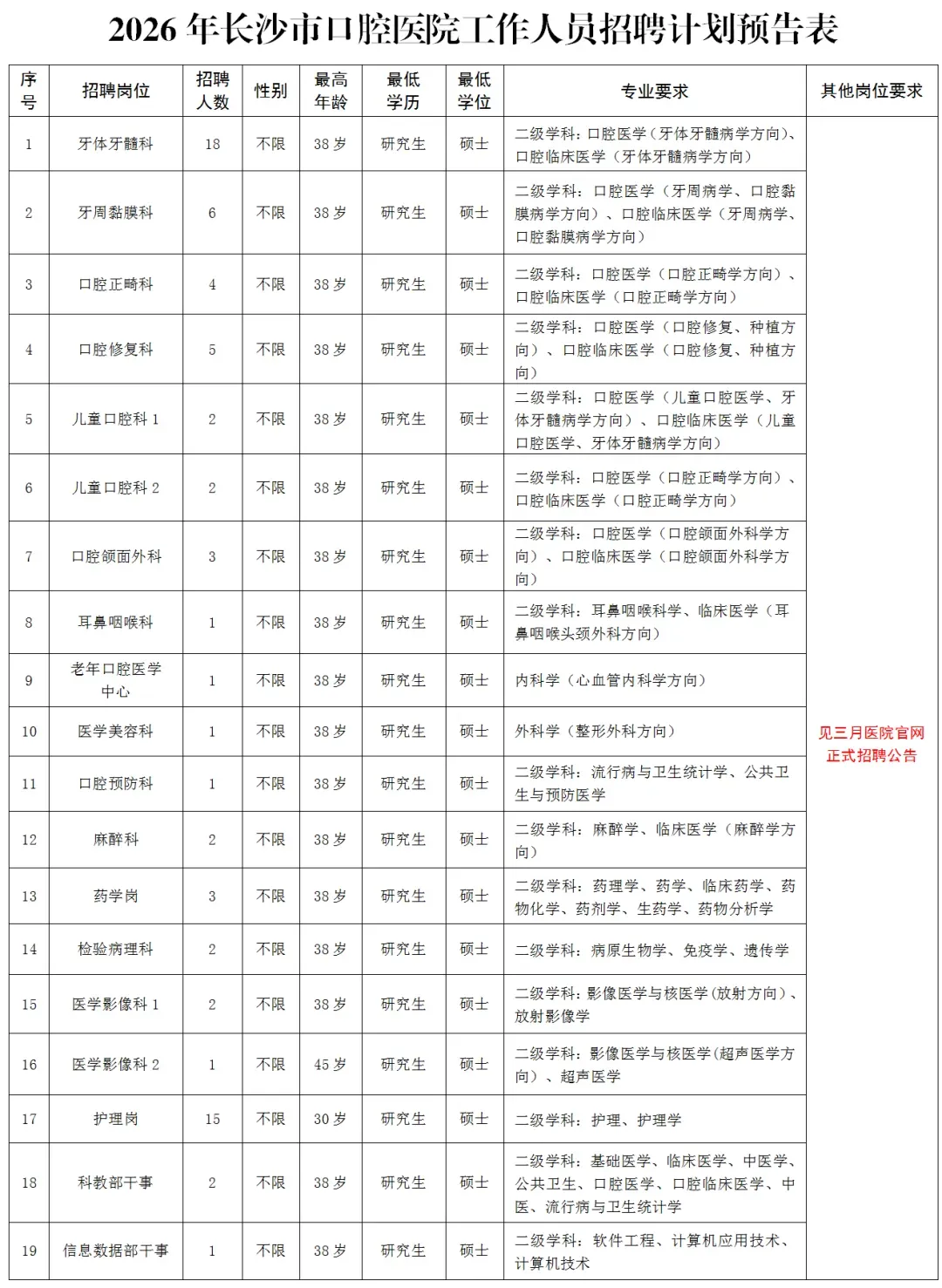 2026年度长沙市口腔医院拟招聘工作人员(研究生)72人,计划表如下: