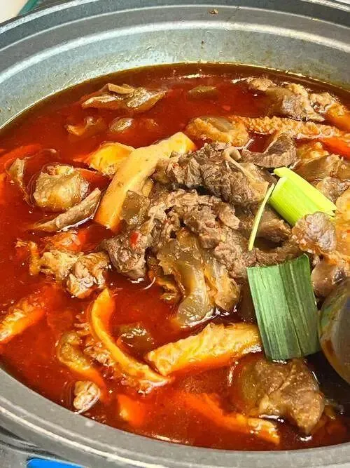 牛三合: 这道菜是冷水江的魂。牛肉、牛血、牛百叶,切得薄薄的。关键在于那口汤,山胡椒油是点睛之笔。大火爆炒后冲入高汤,醋的酸、辣椒的烈、山胡椒油的奇香瞬间炸开。汤一喝,人就醒了,汗从毛孔里钻出来,通体舒畅。