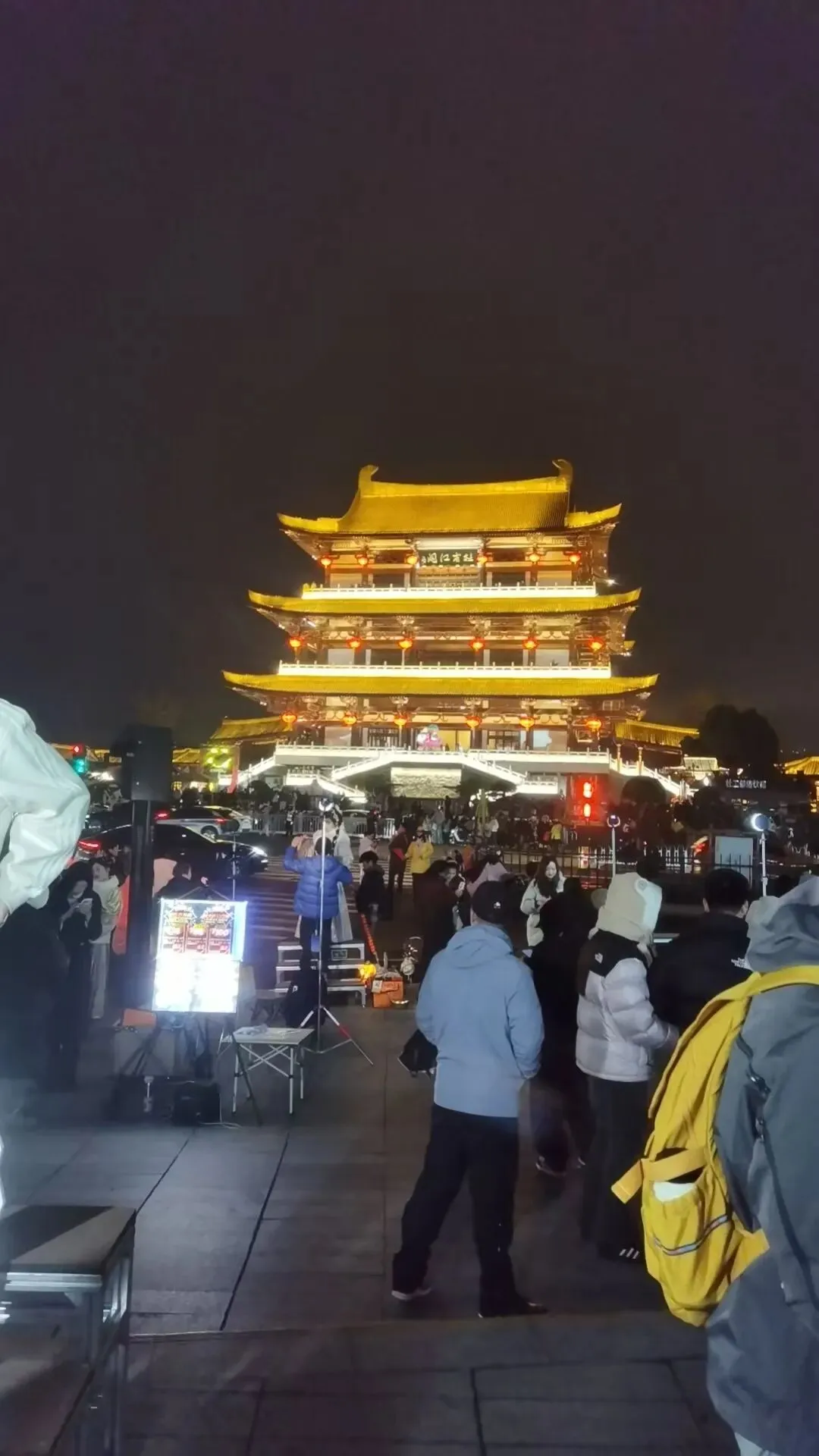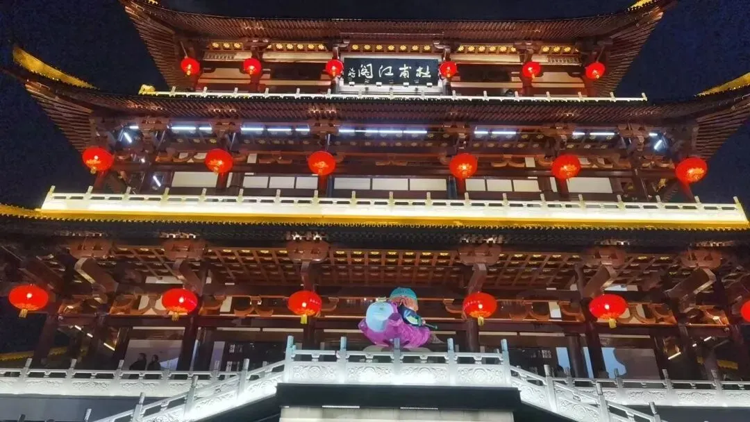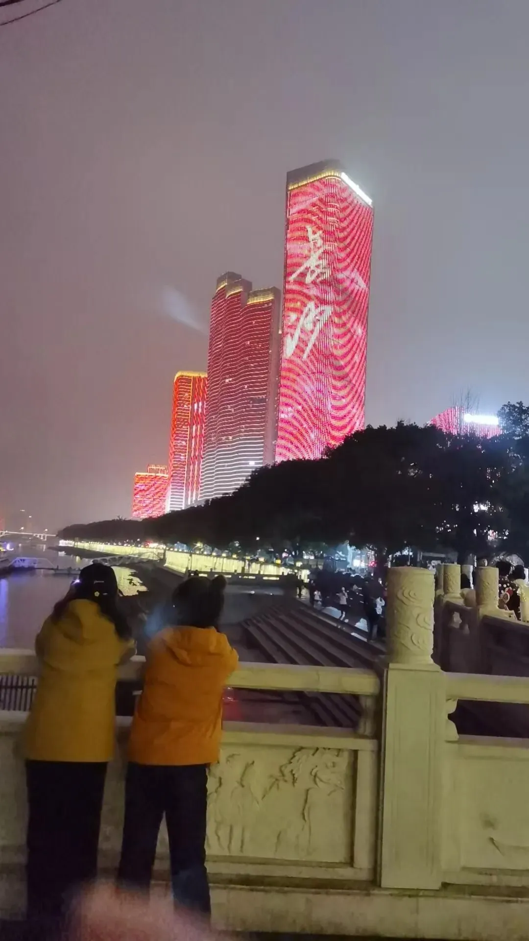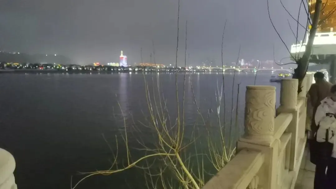 我们出了火宫殿,辣味还在舌尖跳跃,便沿着坡子街向湘江边走去。这时候已经是2月10日晚上9点钟,临近春节的街上不仅没有冷清,反而人山人海,到处都是提着年货、说说笑笑的人群。穿过衣铺街,走上人民路,视野忽然开阔——湘江就这样横在了眼前,而杜甫江阁也毫无预兆地亮在了夜色里。