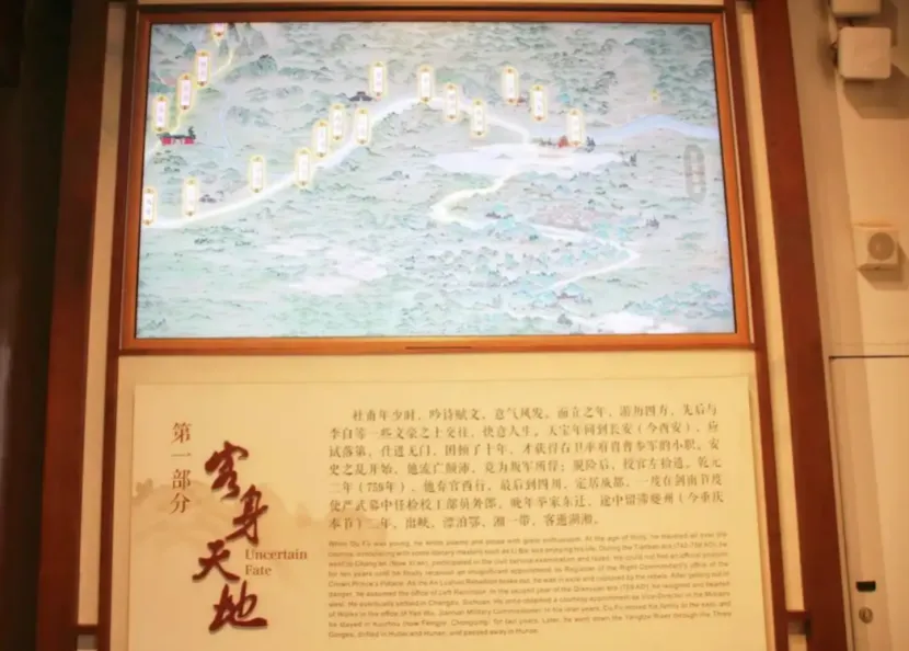 三层是杜甫生平展示馆,以诗画形式呈现他在湘的颠沛与才情。站在那些镌刻在碑廊上的诗句前,看着万字格展墙的设计,仿佛真的穿越了时空,与诗人对话。最让我动容的,是《江南逢李龟年》背后的故事。