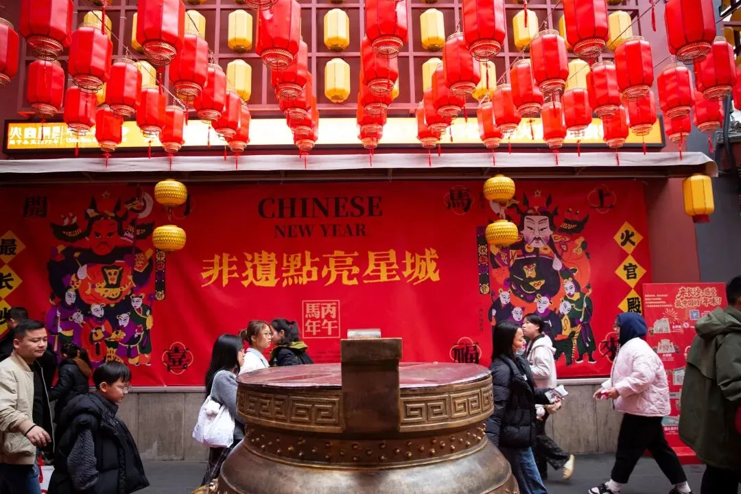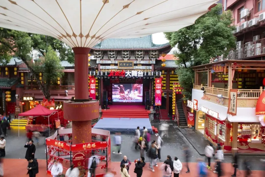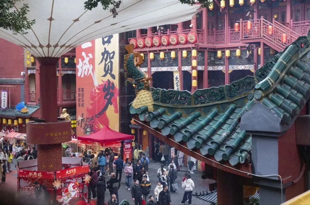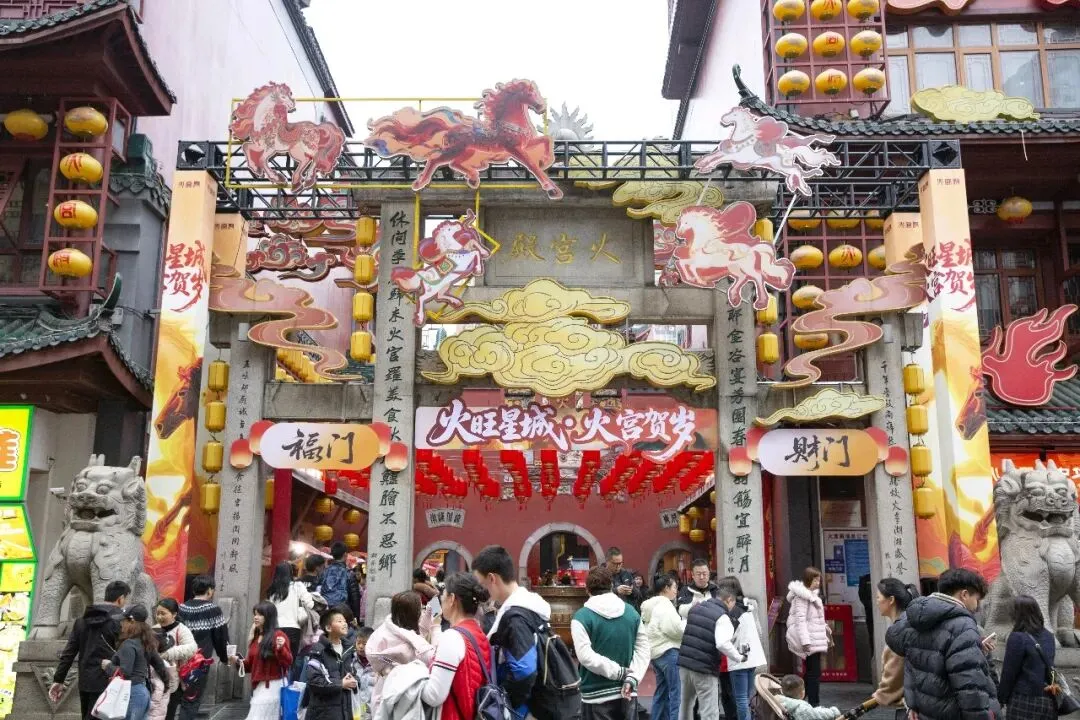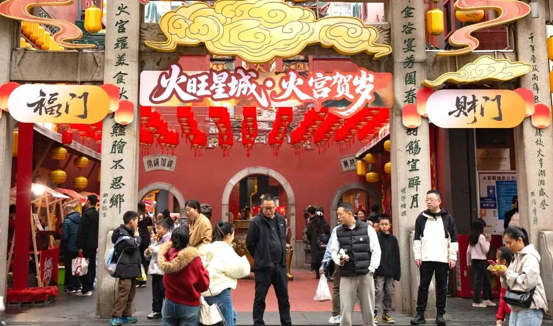 正月初七,长沙火宫殿庙会人头攒动,来这里烧香祈福、品味美食的人们流绎不绝。庙会前牌楼挂满了火红的灯笼。穿过牌楼,一股混合着油炸、糖香和辣味的混合气息扑面而来,这是火宫殿独有的味道。长沙话、普通话、外地口音交织在一起,融进了食物的香气里,汇成一首独特的马年春节庙会交响曲。火宫殿正门上的“火旺星城,火宫贺岁”格外引人注目,头顶上挂满了红灯笼,喜庆、祥和,红红火火的年味扑面而来。大门两旁的小门分别是福门和财门,喻意为福气满满,财源滚滚。庙会中央的戏台,是整个庙会的热闹中心。春节期间,每当夜幕降临,这里便会锣鼓喧天,上演一出出精彩的传统戏曲。