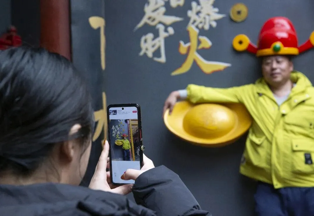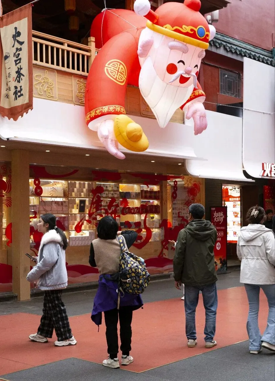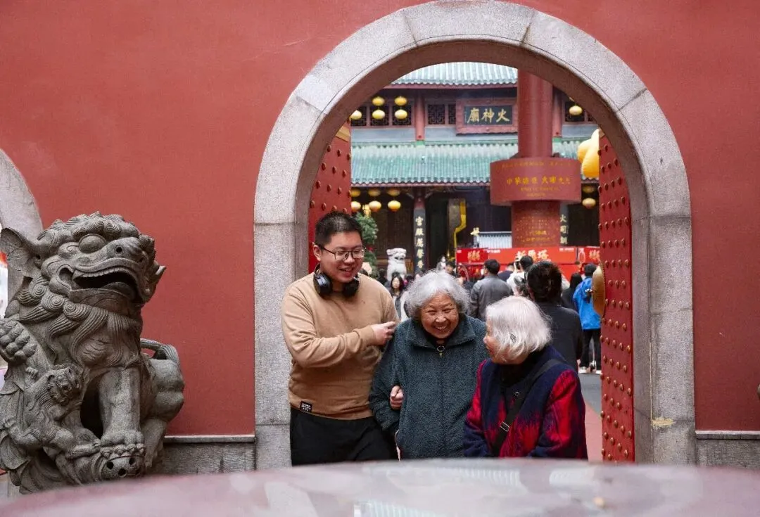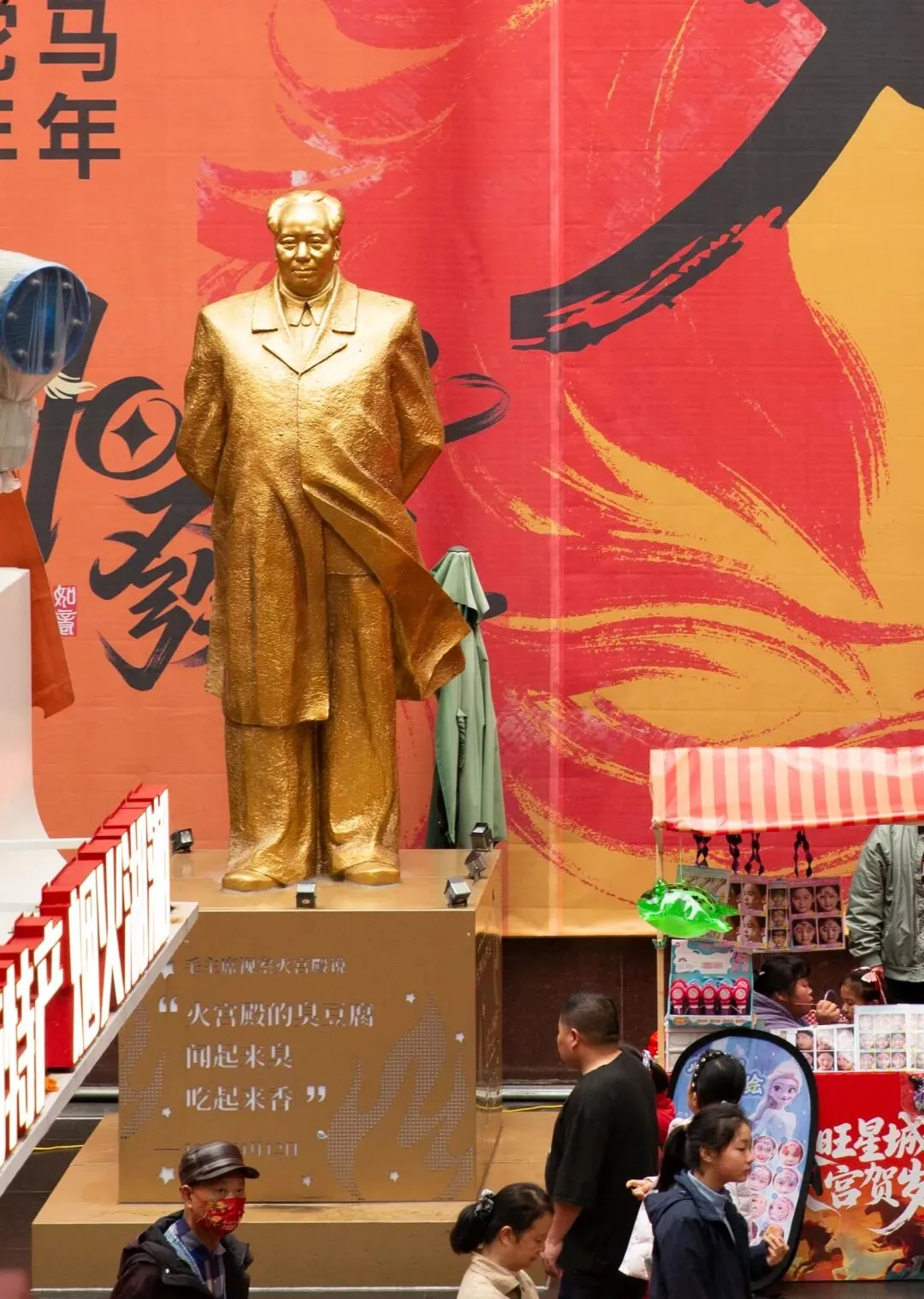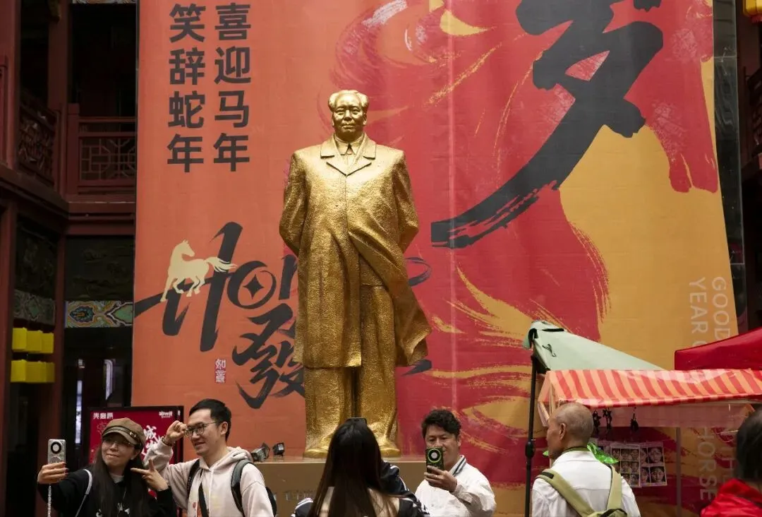 一尊巨大的毛泽东主席铜像矗立在火宫殿入口的左侧,这也是全国唯一一座安放在庙会内的伟人雕像。非遗是庙会的精髓。传统美食、戏曲表演、烧香祈福……浓浓的人间烟火气。庙会上的幸福笑容。一位银发老人在家人陪伴下祈福归来。灿烂的笑容,是马年春节最温暖的画面。当一回财神爷。