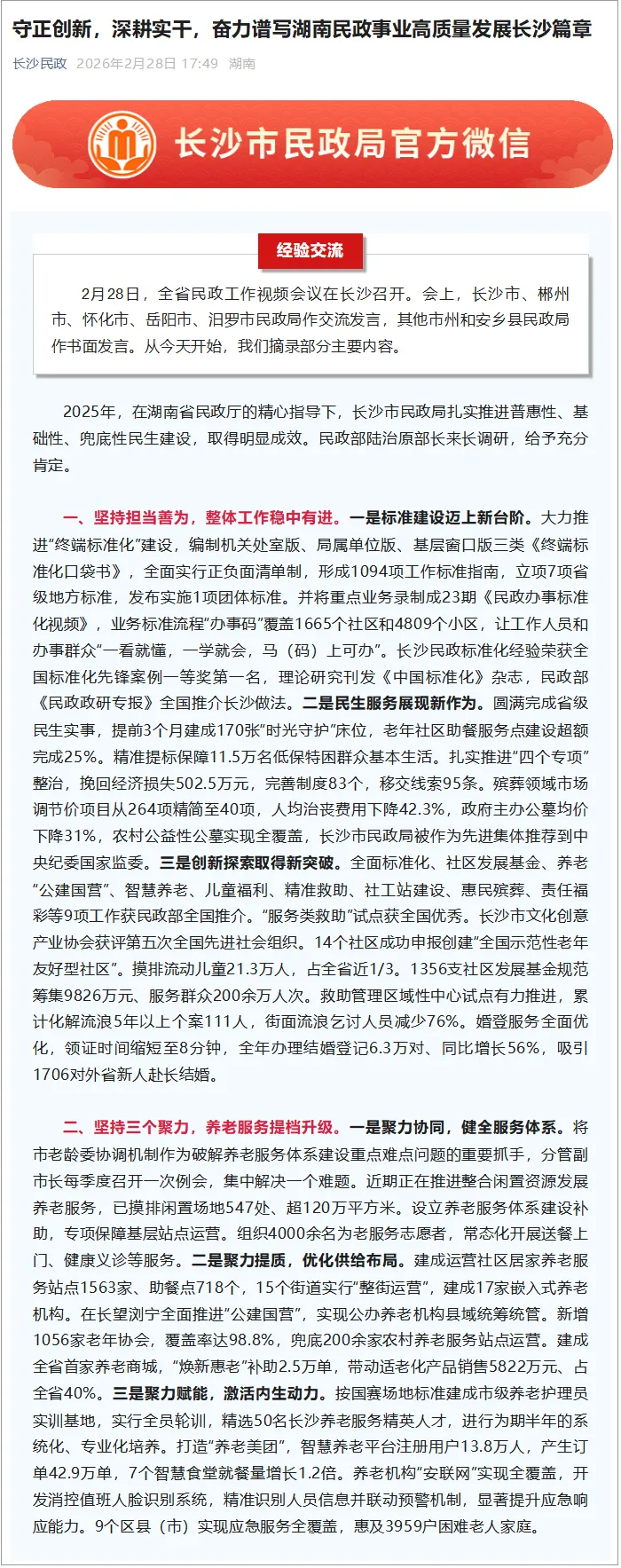 据长沙民政微信2月28日发布的消息,2025年,长沙市民政局在湖南省民政厅指导下,扎实推进普惠性、基础性、兜底性民生建设,取得显著成效,其标准化建设、养老服务、惠民殡葬等9项工作获民政部全国推介,并获得民政部主要领导的肯定。