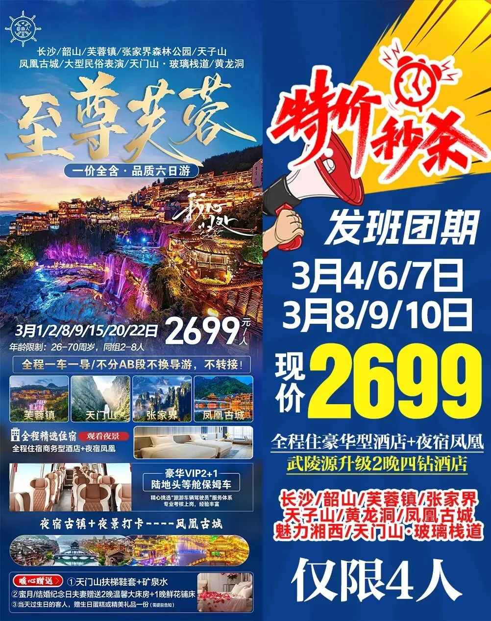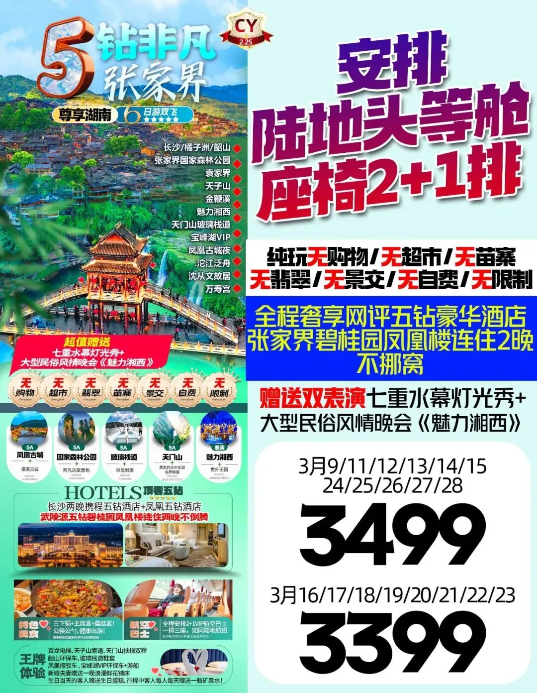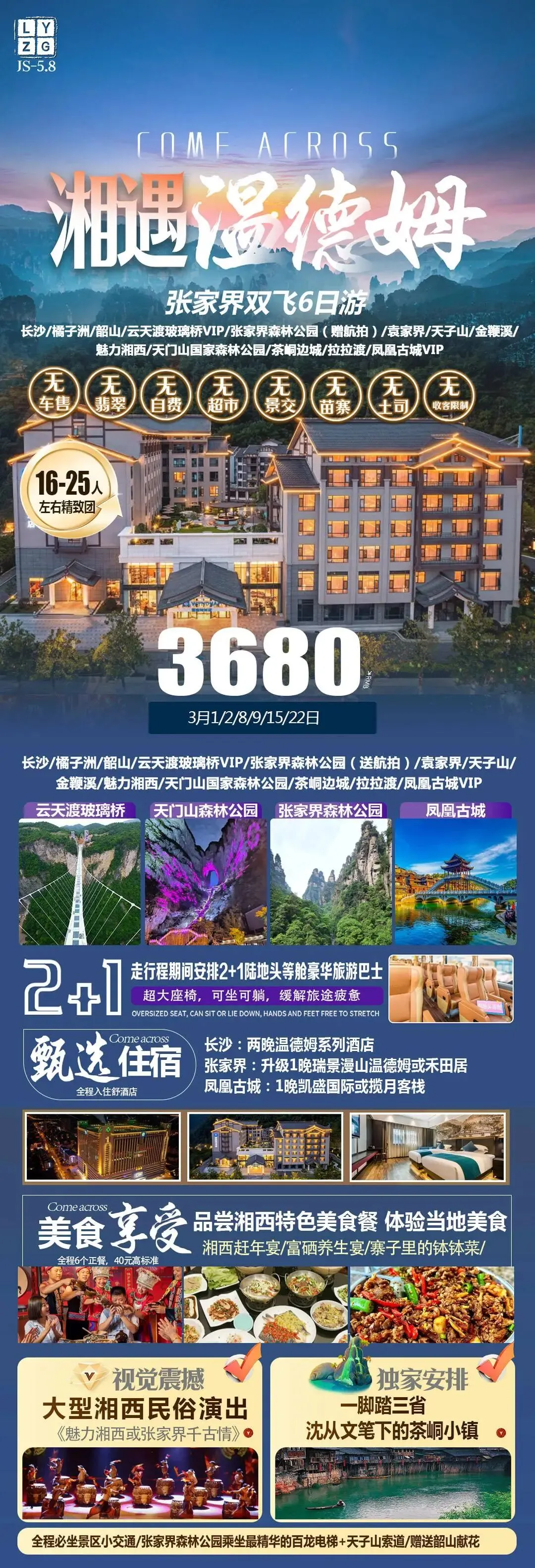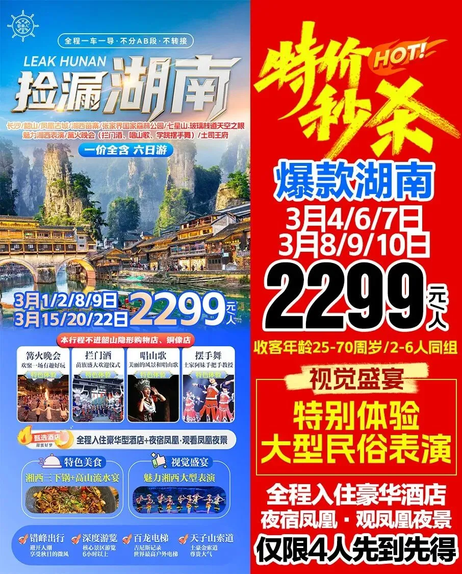 >3月游张家界◎长沙/韶山/凤凰古城/金鞭溪/芙蓉镇/黄龙洞/张家界森林公园/天门山……