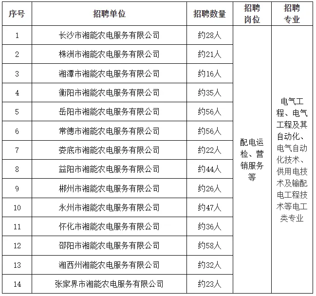 备注:本批次湖南省各市州湘能农电服务有限公司招聘数量含已签订定向培养协议的“定向生”数量;本批次原则上不考虑跨地市级农电服务有限公司的意向单位调剂。