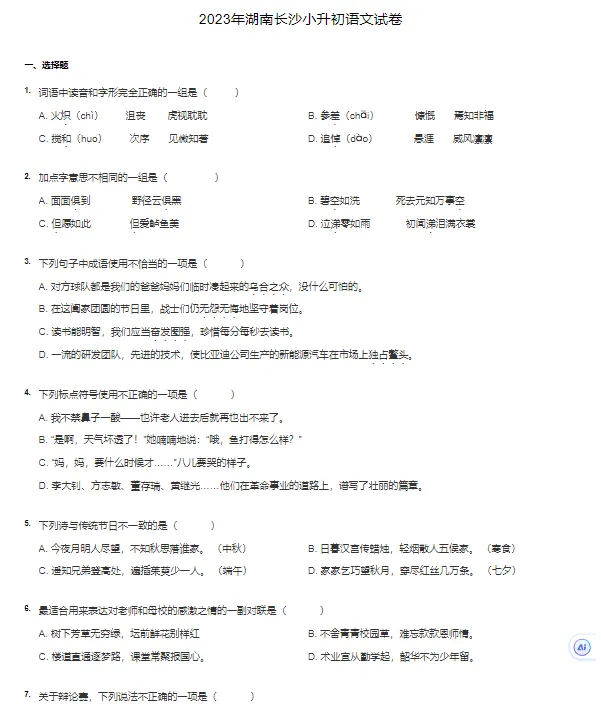 2020-2023学年长沙各区小升初语文真题及答案解析