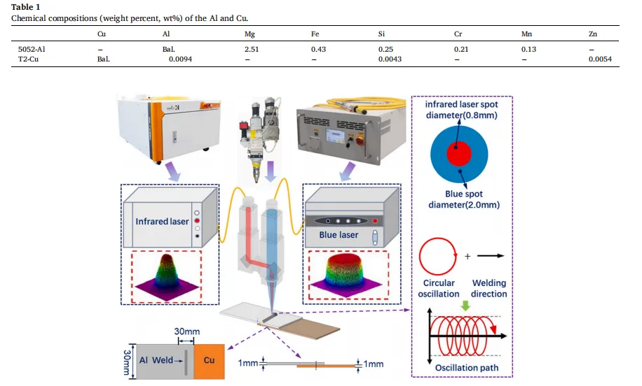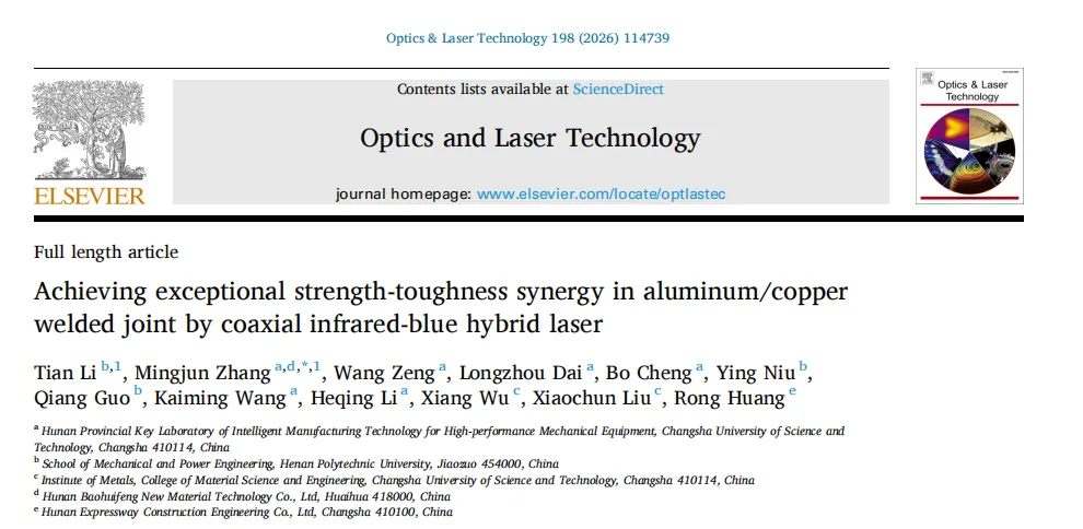 本研究基于红外激光与蓝光激光工艺优势的全面结合,采用红外-蓝光同轴复合激光焊接工艺开展铝-铜搭接焊实验研究。探讨了蓝光激光辅助效应对接头微观组织、力学与电学性能、断裂特征及强化机制的影响,主要结论如下: