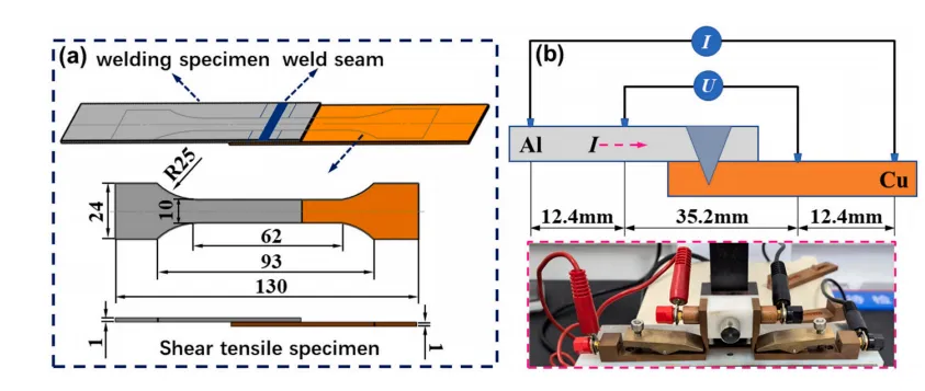 铝/铜界面结合强度的提升主要归因于界面处的位错强化与细晶强化效应,而在原位拉伸过程中裂纹向铜基体扩展则是根状熔池的驱动作用所致,铜基体内的形变强化进一步补偿了接头的韧性。蓝光激光辅助下形成的熔池微观组织不仅增强了接头的强度与韧性,还有利于提升接头的导电性能。其中,接头的最大剪切拉伸强度与韧性分别提升了29.4%和24.2%。