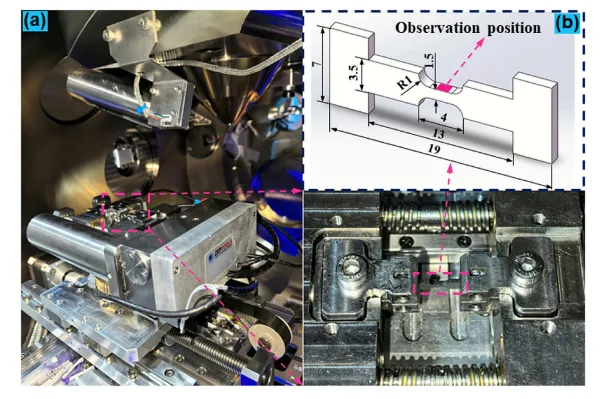 图3. (a) 原位拉伸实验示意图及 (b) 样品尺寸示意图。