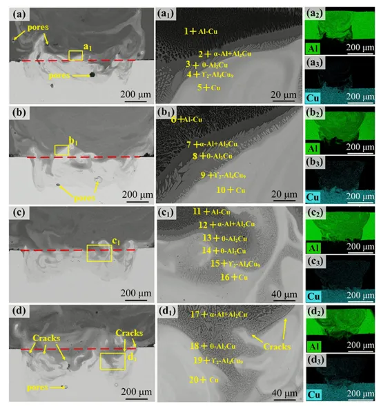 (2)与单一红外激光相比,红外-蓝光复合激光通过降低温度梯度,有效抑制了铜元素向铝熔池的扩散,显著改善了熔池内微观组织的均匀性。