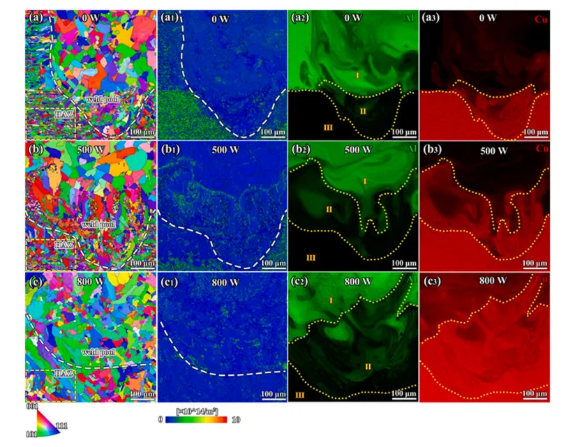 图6.不同蓝光激光功率下熔池的 EBSD 和EDS表面扫描:(a-a3)0W,(b-b3)500W,(c-c3)800W。