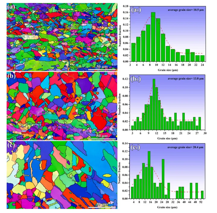图7. 图4中热影响区的放大视图及晶粒尺寸分布:(a-a1) 0 W,(b-b1) 500 W,(c-c1) 800 W。