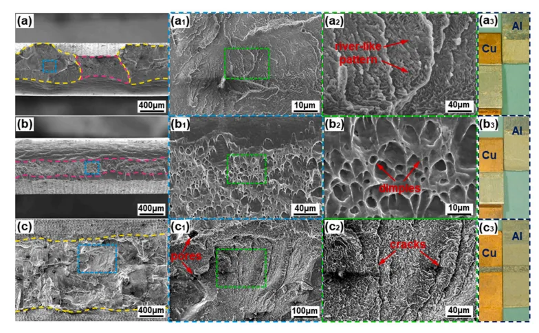 图10. 不同蓝光激光功率下断裂的SEM形貌:(a-a2) 0 W,(b-b2) 500 W,(c-c2) 800 W,以及(a3)、(b3)、(c3)关节的断裂位置。