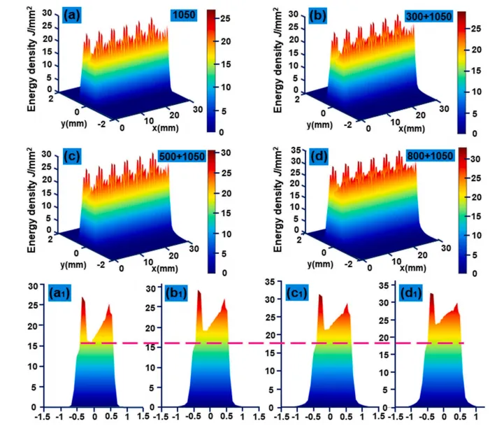图11. 不同蓝光激光功率下的能量密度分布:(a-a1) 0 W,(b-b1) 300 W,(c-c1) 500 W,(d-d1) 800 W。