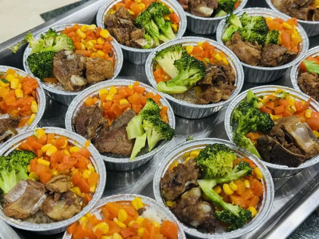 中餐:五彩缤纷、番茄炒蛋、白萝卜炖大骨头汤、软米饭